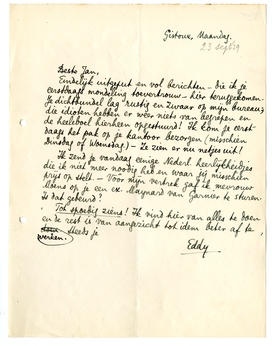 Eindelijk uitgeput en vol berichten-die ik je eerstdaags mondeling toevertrouw-hier teruggekomen. Je dichtbundel lag rustig en zwaar op mijn bureau; die idioten hebben er weer niets van begrepen en de heeleboel hierheen opgestuurd! Ik kom je eerstdaags het pak op je kantoor bezorgen (misschien Dinsdag of Woensdag.)-Ze zien er nu netjes uit!