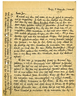 Ik voel me zelden zoo gedrongen om niet ‘per procuratie’ mijn eigen gelukwenschen bij die van Eddy te voegen, in dit geval dus bij zijn lithanie der leeftijden, die zoowaar nog bijna als een officieele feestrede eindigt. Onze gelukwenschen zijn natuurlijk in de eerste plaats wenschen voor beterschap; we hebben met erg veel blijdschap van Greshoff gehoord dat die al in vervulling beginnen te gaan. Ik druk je dus ook schriftelijk van harte de hand, het betreurende dat het niet een beetje materieeler kan. Geef mijn beste groeten aan Griet en de ‘kinderen’ (want ik, om weer met de lithanie der leeftijden te eindigen, hoor evenals Eddy bij de bejaarden).
