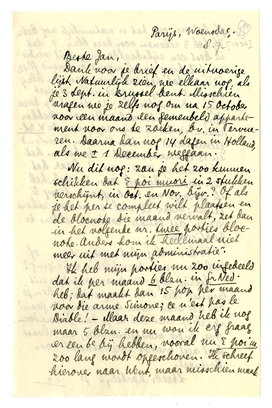 Dank voor je brief en de uitvoerige lijst. Natuurlijk zien we elkaar nog, als je 3 Sept. in Brussel bent. Misschien vragen we je zelfs nog om na 15 October voor een maand een gemeubeld appartement voor ons te zoeken, bv. in Tervueren. Daarna dan nog 14 dagen in Holland, als we ± 1 December weggaan.