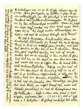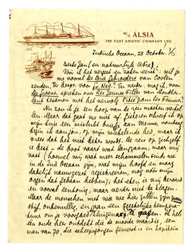 Nu zou ik je een hoop van de reis moeten vertellen. Maar dat gaat me niet af. Gisteren schreef ik op mijn knie een mislukt briefje aan Menno, vandaag begin ik aan jou, op mijn wiebelende bed, maar ik vrees dat het niet beter wordt. De reis op zichzelf is best - de boot vaart wat langzaam, maar vrij vast (hoewel wij wat meer schommelen sinds we in de Ind. Oceaan zijn, wat mijn hoofd en maag dadelijk nauwgezet registreeren, nog vóór mijn oogen dat gedaan hebben); het eten is vrij beroerd en vooral eentonig, maar verder niet te klagen. Maar de menschen met wie we hier zitten zijn zwaar, stijf, onbenullig, en van een geestelijke temperatuur om je voorgoed de kluizenarij in te jagen. Ik heb één oude heer ontdekt die de moeite waard is, een man van 70, die scheepsjongen geweest is en kapitein op zeilschepen nog, en de eerste schepen van de K.P.M., later goudzoeker op Celebes (3 jaar lang) en rubberplanter, en die geëindigd is als superintendent van vele rubberondernemingen. Nu 70 jaar, en hij kan alleraardigst vertellen. Maar hij heeft een naar wijf, zoodat wij hem vaak maar laten waar hij is. Hij heeft anders alleraardigste verhalen, ook wat de inhoud betreft: 100% ‘Conrad’.