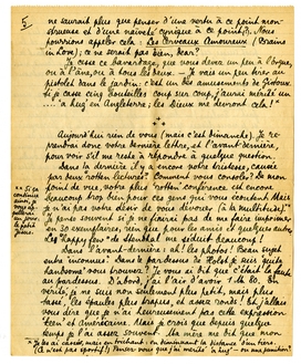 | 6. | Je ne peux pas répondre en ce moment à la partie... tout à fait charmante de votre lettre. Je me laisserai dorloter en silence. J'attends toujours une condemnation, et puis... Si vous vous trouvez heureuse ainsi, même pour très peu de temps, je veux bien être heureux COMME TROIS SEIGNEURS moi aussi. Et soyez sûre qu'en vous voyant, je ne ferai pas allusion à tout cela.