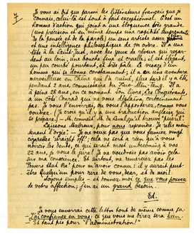 Ce soir je me sens seul à mon tour - parce que vous n'êtes pas là. Vous m'avez gâté, c'est de votre faute peut-être. J'ai l'impression que ce serait terrible si vous deviez me manquer, si vous pouviez ne pas être là à l'heure de ma mort. (C'est pourtant probable!) Dites que, quoi qu'il arrive, pour longtemps à venir vous serez mon amie, que vous resterez dans une certaine mesure la grande Amie Inconnue qu'on appelle à l'heure de la mort. Si on m'avait dit, il y a 6 mois, que cette Amie-là prendrait la figure d'une jeune fille d'Oxford, j'aurais pouffé de rire. En ce moment j'admets - j'ai la folie de croire que c'est ainsi, que cette Amie est anglaise (with a good streak of Celtish blood in her veins), qu'elle a 22 ans, qu'elle s'appelle Eveline.