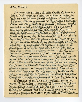 Venez tout près de moi, Julia, Eucharys, Eucharys et Julia. Vrai, j'aime Julia autant qu'Eucharys. En ce moment je veux toujours Julia. Peut-être que Julia deviendra Eucharys tout à l'heure. C'est même probable - pendant, ou après cette lettre. Pour le moment il me faut Julia. La superstitieuse, la sérieuse; et ne vous y méprenez pas: je l'embrasserai beaucoup. Je l'embrasse déjà: sur les yeux, sur les lèvres. Doucement sur les yeux. Et je dis: Vous vous êtes trompée, ma grande petite superstitieuse: mercredi soir à 10 heures je vous écrivais; il m'était arrivé justement un très grand bonheur, car je venais de recevoir une si gentille lettre de Ma Dame, et je l'admirais beaucoup et je l'aimais davantage et j'écrivais un peu, autant que je pouvais mais c'était très boiteux quand même, mon amour à Ma si gentille Dame. Vous n'avez pas encore cette lettre? Mais si; en ce moment vous l'avez. Celle-là - une assez longue - et une autre qui l'avait précédée. En ce moment vous l'avez; celle-là, et celle-ci vous sera expédié demain; de très bonne heure. Dites-moi: croyez-vous que je vous aime? Que je vous aime, tout à fait, sans aucune réserve, passionnément, tendrement, respectueusement - toutes les feuilles de la marguerite - et toujours avec mon ‘sentiment de fond?’ Dites-moi si vous croyez, maintenant. Un peu. À ceci aussi je tiens beaucoup!