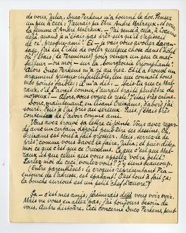 Julia, vous commencez à me comprendre, mais vous ne me connaissez pas encore tout à fait. Ni moi vous, d'ailleurs. Ce sera pour plus tard. On finira bien par se connaître, quand on se sera débarassé de toute méfiance, si légère soit-elle. Pour le moment l'essentiel est qu'on s'aime. Que nous nous aimons. Vous vous souvenez de ceci: Moi revenant auprès de vous, on allait se quitter, il faisait très-noir: Julia, je vous aime. Vous m'aimez? - Je vous aime, mon chéri.... (les deux derniers mots plus que les autres in a whisper.)