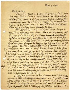 Dank voor brief en bijgaande papieren. Ik lig voor het oogenblik met een nieuwe verkoudheid tegen de vlakte (lees: onder de dekens), maar geef eerstdaags de proeven met een ‘bon à tirer’ terug. Ik verwacht de copie voor omzendkaart en onze driehoek. Je hebt vergeten mij het adres van Casteels te geven.