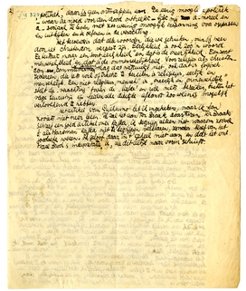 Het beroerde is dat alle woorden die we gebruiken, min of meer door het christendom verpest zijn. Eerlijkheid is ook zoo'n woord. Er bestaat maar een soort ‘eerlijkheid’ en dat is de oneerlijkheid. Een soort ‘menschelijkheid’ en dat is de onmenschelijkheid. Voor religies als christendom, communisme of fascisme mag dat natuurlijk niet, ook dat is logisch. Iedereen, die iets wil of tracht te bereiken is religieus, eerlijk en menschelijk. Een niet religieus ‘mensch’ is ‘oneerlijk’ en ‘onmenschelijk’, stelt de ‘verachting’ boven de ‘liefde’ en wil niets bereiken, buiten het vage bewustzijn zijn heidensche dierlijke afkomst zoo weinig mogelijk verloochend te hebben.