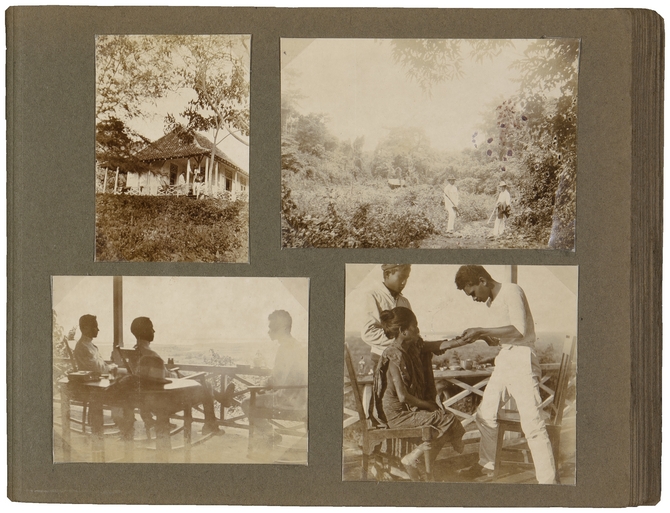 ![]() Linksboven: de kliniek waar de patiënten werden geholpen Rechtsboven: E. du Perron en dokter Fanggideaj (op achterzijde: Op weg naar Gowa Koening 7 Maart ’20) Linksonder: E. du Perron, Paul Beynon, dokter Fanggideaj (op achterzijde: Tembajangan 14 Maart ’20) Rechtsonder : dokter Fanggideaj geeft een injectie met neosalvarsan tegen de ziekte framboesia tropica |