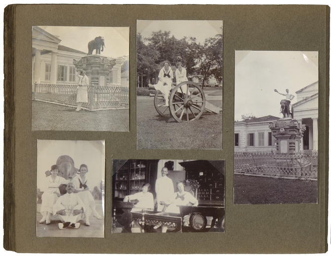 ![]() In en om het museum van het Bataviaasch Genootschap, met niet geïdentificeerde werknemers. Geheel rechts E. du Perron, triomfantelijk gezeten op het beeld van de Siamese olifant, die Koning Chulalongkorn van Thailand in 1871 aan het museum heeft geschonken ‘April ’21’ |