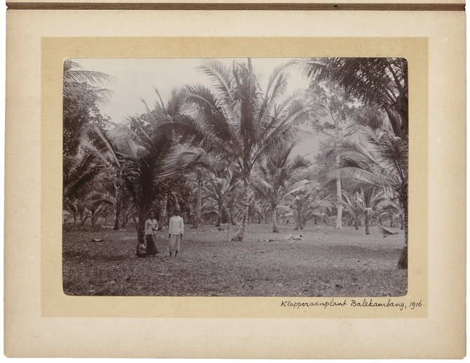 (op achterzijde: Klapperaanplant, nabij de plaats van het voormalige woonhuis, met het gezicht naar de Tjimarindjoeng. Voor het eerst uit het vuil gehaald sedert 6 jaar, in April 1916. Mandoer en vrouw)