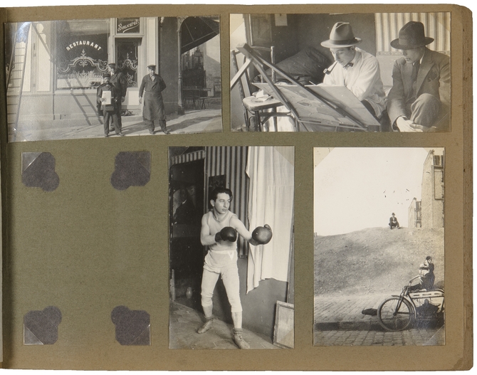 ![]() Linksboven: Place du Tertre, hoek rue Mont-Cenis. Boven dit restaurant woonde de Schotse schilder Samuel (Paul) Jeffay (op achterzijde: Bouscarat, Place du Tertre) Rechtsboven: Paul Jeffay (met pijp) en de Griekse schilder Tin Florias Linksonder: Paul Jeffay Rechtsonder: E. du Perron |