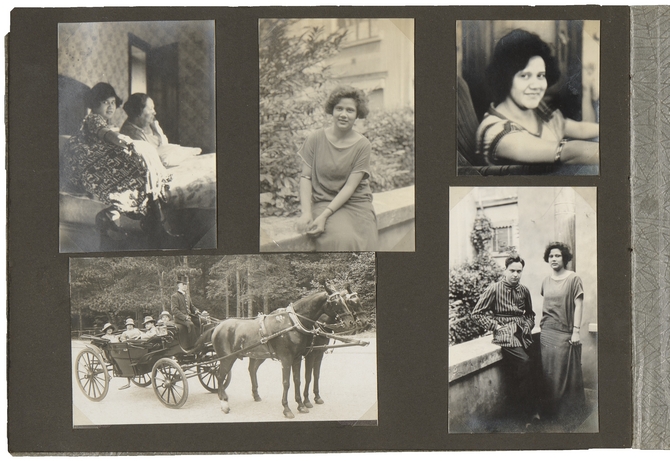 ![]() Bovenste foto’s: Leni Aronds, een vriendin uit de Bandoengse tijd. Linksboven mogelijk met haar moeder Linksonder: E. du Perron, Leni Aronds en twee anderen in een koets. Foto toegestuurd aan Oscar Duboux (op achterzijde: Monsieur Oscar Duboux/ Châlet Mon Repos/ Les Diablerets/ (Suisse). Saluts de Bruxelles/ saluts pleins d’angoisse/ tu ne m’écris plus?) Rechtsonder: E. du Perron en Leni Aronds, mogelijk in Bellevuestraat 3, Brussel |