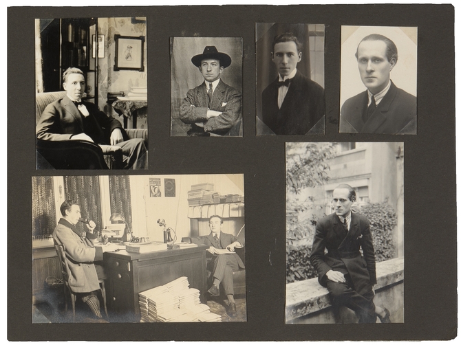![]() Linksboven: Fernand Berckelaers, alias Michel Seuphor, op bezoek bij Du Perron in Brussel Hiernaast v.l.n.r. portretfoto’s van Jozef Peeters, Michel Seuphor en Carel Willink Linksonder: de redactie van tijdschrift Het Overzicht: Seuphor en Peeters Rechtsonder: Carel Willink, Bellevuestraat 3 |