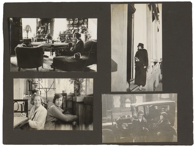 ![]() Linksboven: De dichteres Alice Nahon als gezelschapsdame van Madeline du Perron-Bédier de Prairie, Bellevuestraat 3, Brussel, (op achterzijde: Belle-vue Oct. ’24) Linksonder: Alice Nahon (links) Rechtsboven: Alice Nahon voor de Bellevuestraat 3 Rechtsonder: Alice Nahon en mevrouw Du Perron met chauffeur |