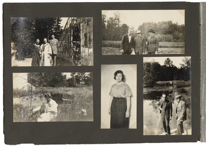 ![]() Linksboven: Madeline du Perron (midden), vermoedelijk in de gemeente Gistoux, waar naartoe de familie verhuisde op 20 maart 1926 Rechtsboven: Ade Tissing, E. du Perron, Carel Willink, (op achterzijde: Juni ’25) [moet zijn: Juni ’26] Rechtsonder: Carel Willink en E. du Perron |