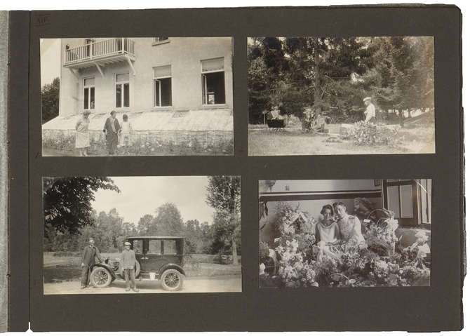 ![]() Linksboven: Madeline du Perron (midden) bij de kassen naast het Château de Gistoux Linksonder: Ade Tissing en Du Perrons chauffeur voor de T-Ford van de familie Rechtsboven: kinderwagen (met Gille), mevrouw Du Perron, E. du Perron, de tuinman – in de tuin van Château de Gistoux Rechtsonder: de bruiloft van Gonda Jordaan met Arend Andries Bontekoe, (op achterzijde: Magelang Oct. 26) |