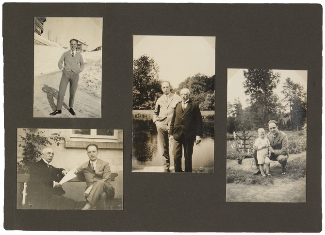 ![]() Linksboven: Anthonie Donker in het Zwitserse kuuroord Arosa (op achterzijde: Februari 1929/ Arosa/ ik kom er weer bovenop!/ Anthonie Donker) Linksonder en midden: Anthonie Donker en een ongeïdentificeerde heer, in Gistoux, juli 1929 Rechts: Anthonie Donker en Gille du Perron |
