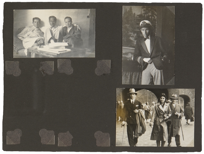 ![]() Linksboven: J. Slauerhoff, Adriaan Roland Holst, E. du Perron (op achterzijde in handschrift Du Perron: Ondanks de bolwerken van ’t land: / De Favoriet, en Astra, Nova,/ wijst men niet zoo maar van de hand/ dit broos gebouw op Bouws z’n sofa), september 1930 Rechtsboven: J. Slauerhoff Rechtsonder: bij de Gevangenpoort in Den Haag: vermoedelijk Everard Bouws (rechts) en diens geliefde Hertha (midden) en J. Slauerhoff (links) |