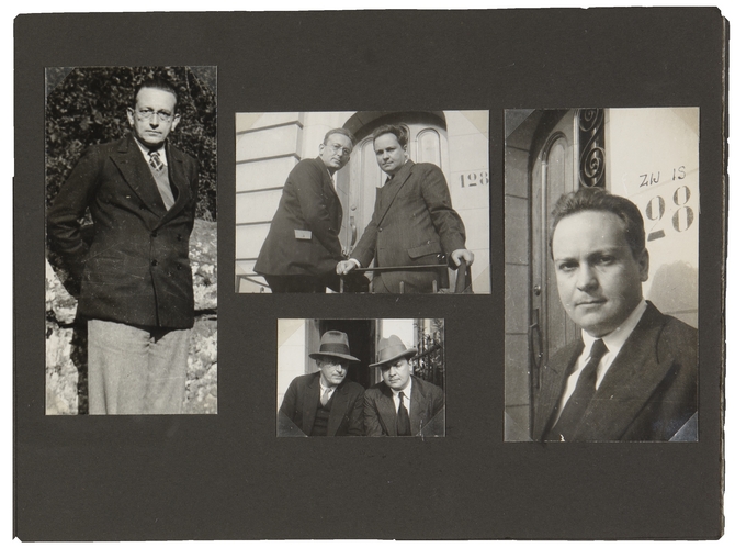 Midden boven en onder: Jan Greshoff en E. du Perron voor het huis van Greshoff, Boulevard August Reyers 128