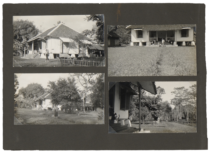 ![]() Tjitjoeroeg, december 1936. Teksten van de hand van Du Perron: Linksboven: zijkant (1e deur links is van mijn werkkamer, 2e van de logeerkamer) Linksonder: het huis v. opzij, zooals je ’t ziet als je binnenrijdt bijv. Die palissade is een geïmproviseerd speeltuintje voor Alain; onder die boengoerboom hebben we vaak gezeten, soms heele dagen gelezen Rechtsboven: voorkant (dak is er afgeslagen door onbenul van Rassidi die deze kiek moest maken Rechtsonder:gezicht op ‘oprit’ en zijtuintje |