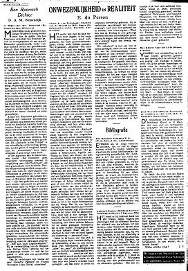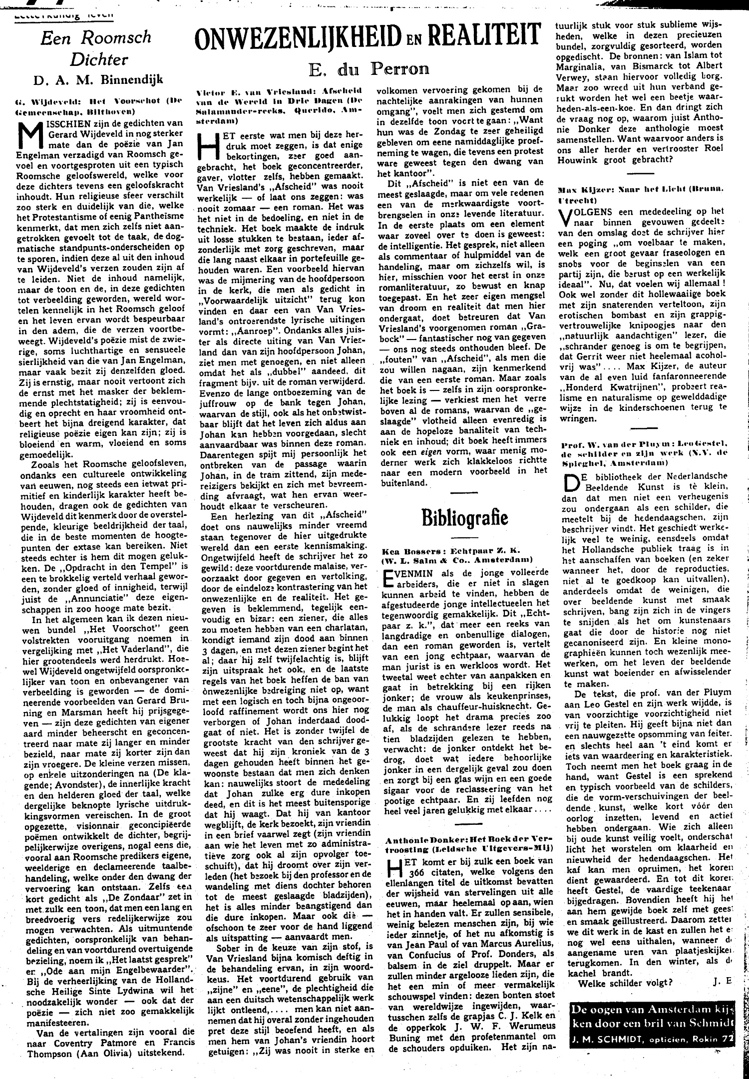 Dit Afscheid is niet een van de meest geslaagde, maar om vele redenen een van de merkwaardigste voortbrengselen in onze levende literatuur. In de eerste plaats om een element waar zoveel over te doen is geweest: de intelligentie. Het gesprek, niet alleen als commentaar of hulpmiddel van de handeling, maar om zichzelfs wil, is hier misschien voor het eerst in onze romanliteratuur zo bewust en knap toegepast. En het zeer eigen mengsel van droom en realiteit dat men hier ondergaat, doet betreuren dat Van Vriesland's voorgenomen roman Grabock - fantastischer nog van gegeven - ons nog steeds onthouden bleef. De ‘fouten’ van Afscheid, als men die zou willen nagaan, zijn kenmerkend die van een eerste roman. Maar zoals het boek is - zelfs in zijn oorspronkelijke lezing - verkiest men het verre boven al de romans, waarvan de ‘geslaagde’ vlotheid alleen evenredig is aan de hopeloze banaliteit van techniek en inhoud; dit boek heeft immers ook een eigen vorm, waar menig moderner werk zich klakkeloos richtte naar een modern voorbeeld in het buitenland.