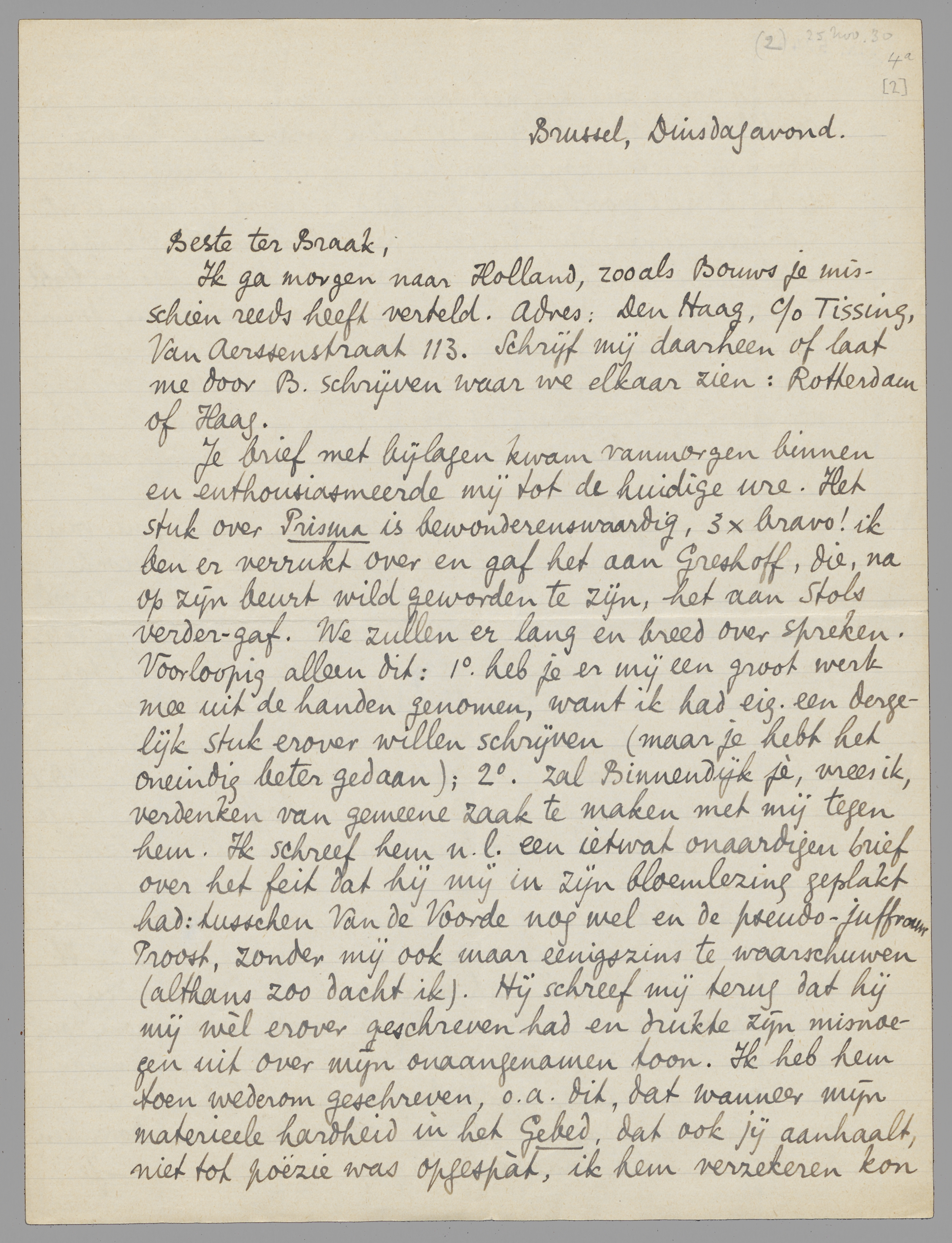 Je brief met bijlagen kwam vanmorgen binnen en enthousiasmeerde mij tot de huidige ure. Het stuk over Prisma is bewonderenswaardig, 3 × bravo! ik ben er verrukt over en gaf het aan Greshoff, die, na op zijn beurt wild geworden te zijn, het aan Stols verder-gaf. We zullen er lang en breed over spreken. Voorloopig alleen dit: 1o. heb je er mij een groot werk mee uit de handen genomen, want ik had eig. een dergelijk stuk erover willen schrijven (maar je hebt het oneindig beter gedaan); 2o. zal Binnendijk je, vrees ik, verdenken van gemeene zaak te maken met mij tegen hem. Ik schreef hem n.l. een ietwat onaardigen brief over het feit dat hij mij in zijn bloemlezing geplakt had: tusschen Van de Voorde nog wel en de pseudojuffrouw Proost, zonder mij ook maar eenigszins te waarschuwen (althans zoo dacht ik). Hij schreef mij terug dat hij mij wèl erover geschreven had en drukte zijn misnoegen uit over mijn onaangenamen toon. Ik heb hem toen wederom geschreven, o.a. dit, dat wanneer mijn materieele hardheid in het Gebed, dat ook jij aanhaalt, niet tot poëzie was opgespàt, ik hem verzekeren kon dat zij ook nooit tot het door hem gewenschte artikel zou ‘ontbloeien’ (of ‘uitbloeien’); reden waarom ik het ook voor hem niet bizonder erg vond wanneer ik in een volgende druk niet voorkwam. (Ik had n.l. ook in mijn eerste schrijven gevraagd mij in een event: herdruk te schrappen.) - Ik schrijf je dit omdat de coïncidentie in het oog loopt. Hij zal meenen dat wij elkaar hierover schreven, terwijl ik, wetend dat hij een vriend van je is, je met geen woord over de affaire zou hebben gerept. Maar wij schijnen werkelijk voorbeschikt om elkaar - althans in deze aera van ons leven - op een afstand en zonder woorden te verstaan!