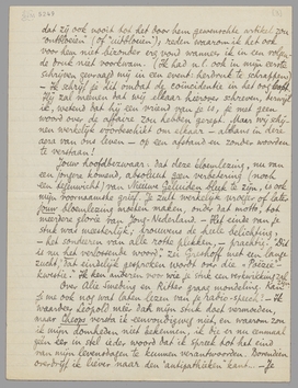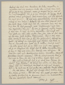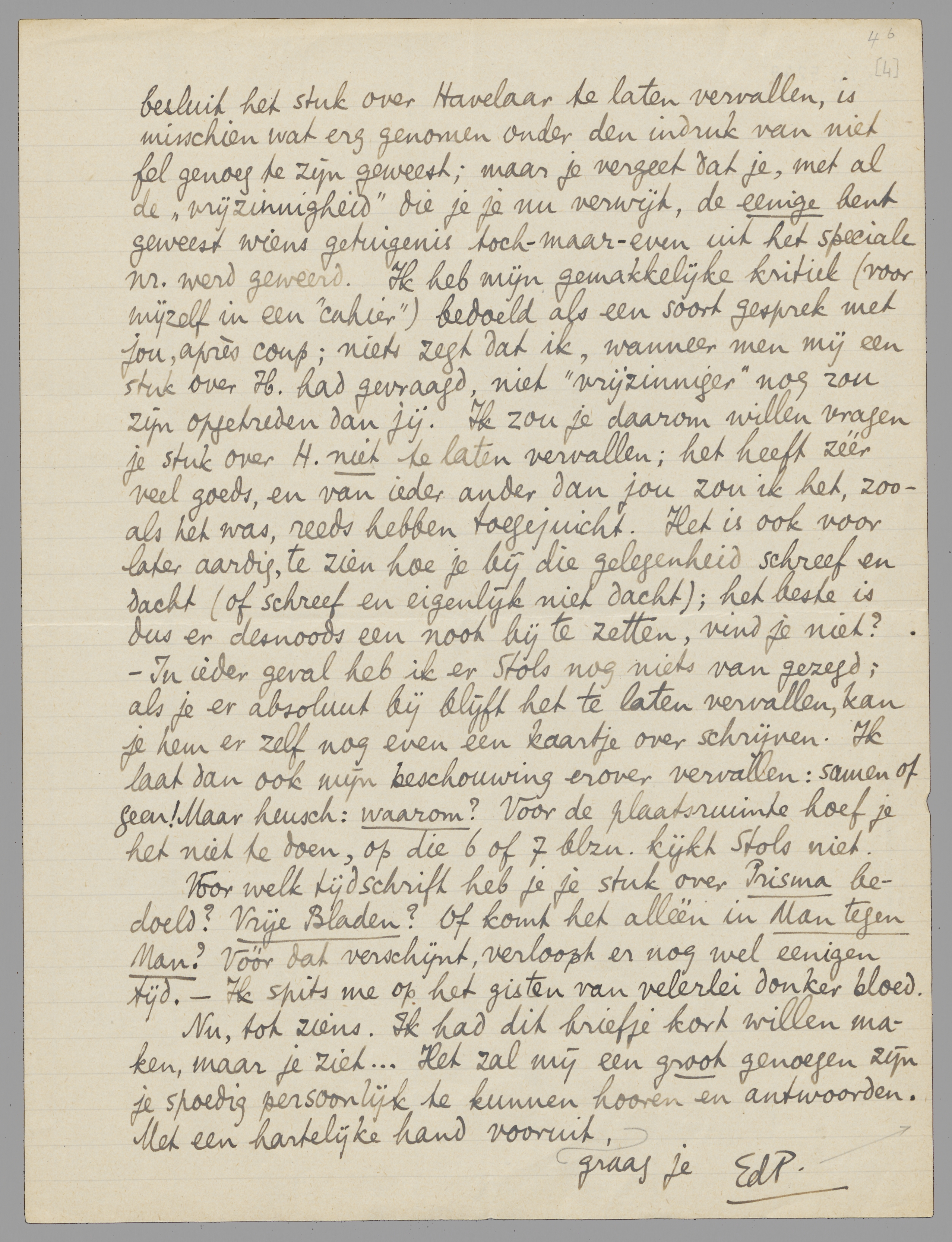 Over Alie Smeding en Ritter graag mondeling. Kan je me ook nog wat laten lezen van je radio-speech? - Ik waardeer Leopold méér dan mijn stuk doet vermoeden, maar Cheops versta ik eenvoudigweg niet, en waarom zou ik mijn domheden niet bekennen, ik die er nu eenmaal géén eer in stel ieder woord dat ik spreek tot het eind van mijn levensdagen te kunnen verantwoorden. Bovendien overdrijf ik liever naar den ‘antipathieken’ kant... - Je besluit het stuk over Havelaar te laten vervallen, is misschien wat erg genomen onder den indruk van niet fel genoeg te zijn geweest; maar je vergeet dat je, met al de ‘vrijzinnigheid’ die je je nu verwijt, de eenige bent geweest wiens getuigenis toch-maar-even uit het speciale nr. werd geweerd. Ik heb mijn gemakkelijke kritiek (voor mijzelf in een ‘cahier’) bedoeld als een soort gesprek met jou, après coup; niets zegt dat ik, wanneer men mij een stuk over H. had gevraagd, niet ‘vrijzinniger’ nog zou zijn opgetreden dan jij. Ik zou je daarom willen vragen je stuk over H. niet te laten vervallen; het heeft zéér veel goeds, en van ieder ander dan jou zou ik het, zooals het was, reeds hebben toegejuicht. Het is ook voor later aardig, te zien hoe je bij die gelegenheid schreef en dacht (of schreef en eigenlijk niet dacht); het beste is dus er desnoods een noot bij te zetten, vind je niet? - In ieder geval heb ik er Stols nog niets van gezegd; als je er absoluut bij blijft het te laten vervallen, kan je hem er zelf nog even een kaartje over schrijven. Ik laat dan ook mijn beschouwing erover vervallen: samen of geen! Maar heusch: waarom? Voor de plaatsruimte hoef je het niet te doen, op die 6 of 7 blzn. kijkt Stols niet.