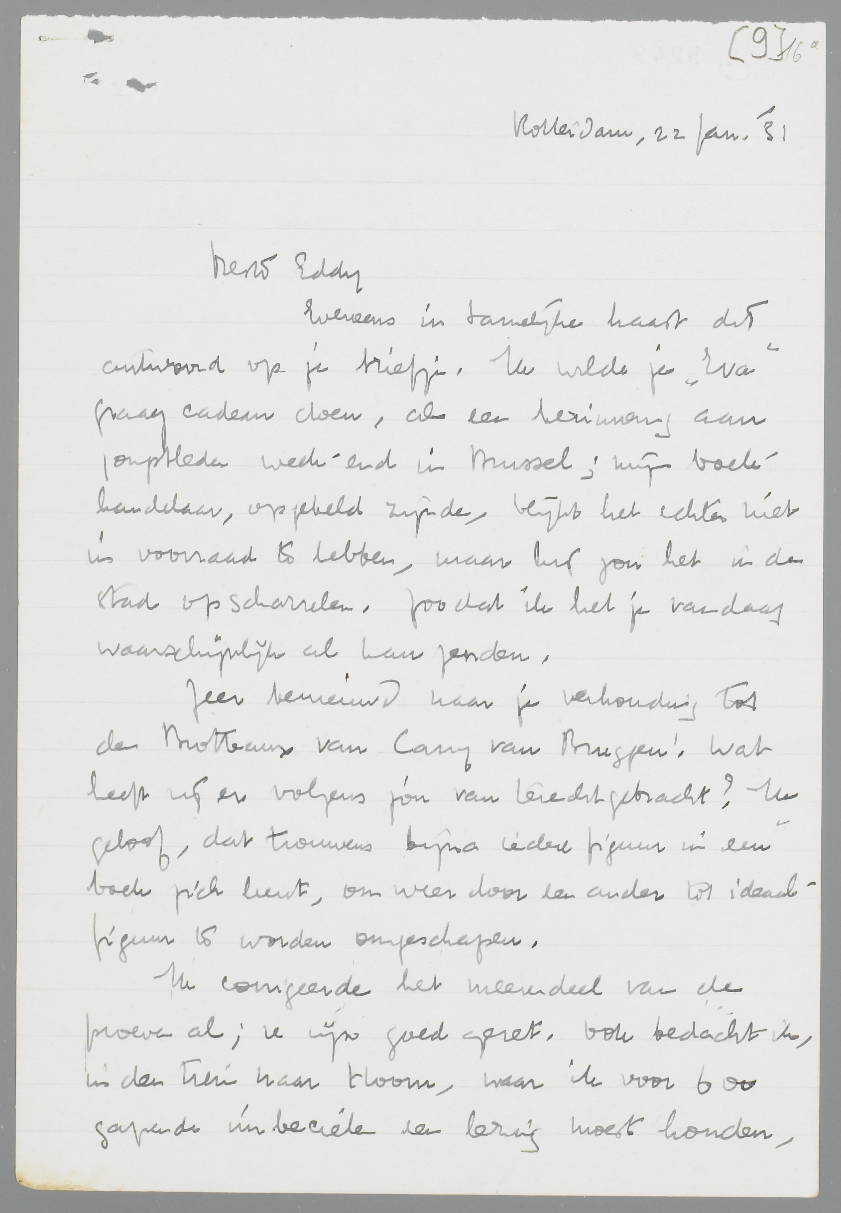 Eveneens in tamelijke haast dit antwoord op je briefje. Ik wilde je Eva graag cadeau doen, als een herinnering aan jongstleden week-end in Brussel; mijn boekhandelaar, opgebeld zijnde, blijkt het echter niet in voorraad te hebben, maar hij zou het in de stad opscharrelen. Zoodat ik het je vandaag waarschijnlijk al kan zenden.