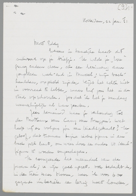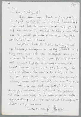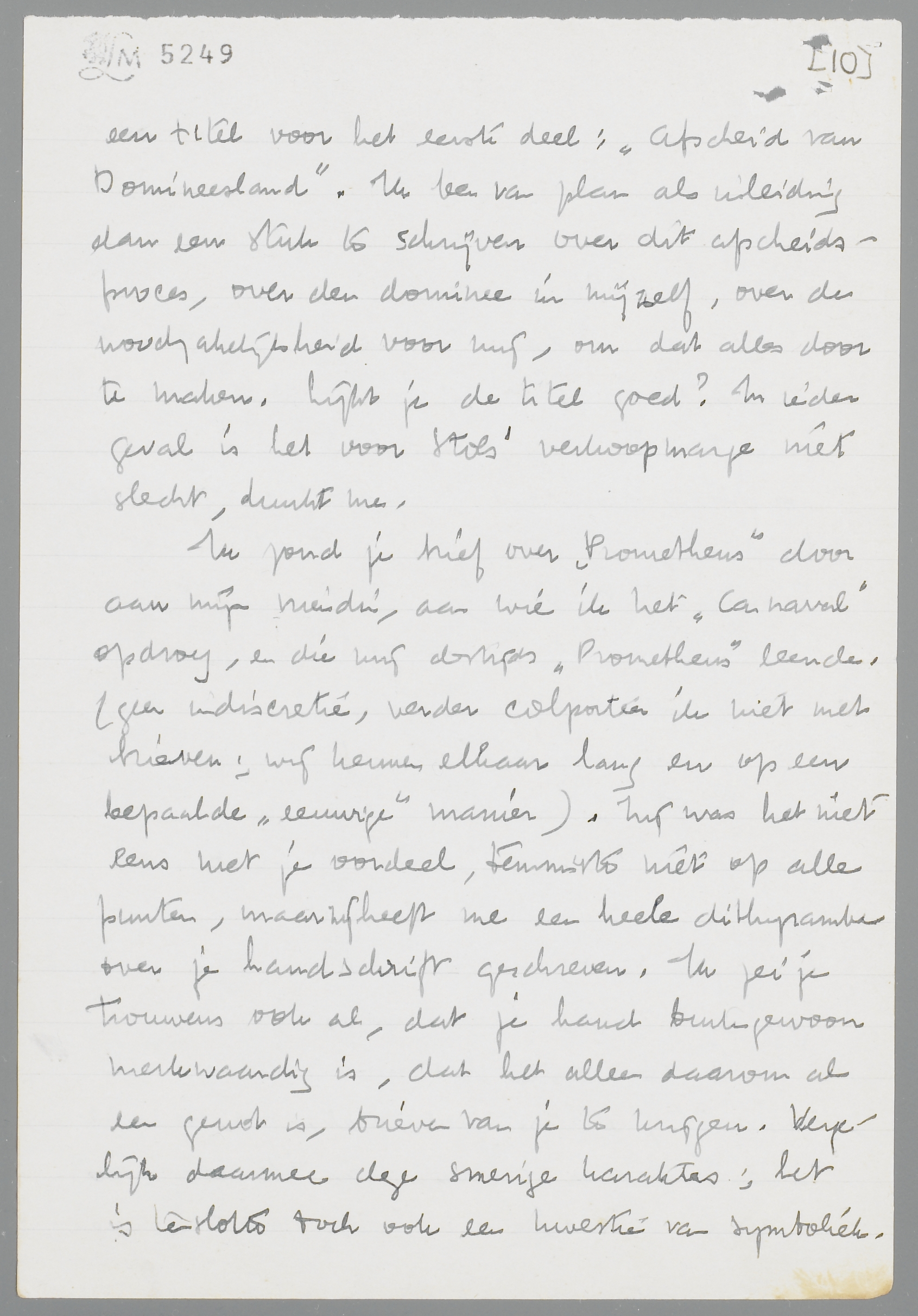 Ik zond je brief over Prometheus door aan mijn vriendin, aan wie ik het Carnaval opdroeg, en die mij destijds Prometheus leende (geen indiscretie, verder colporteer ik niet met brieven; wij kennen elkaar lang en op een bepaalde ‘eeuwige’ manier). Zij was het niet eens met je oordeel, tenminste niet op alle punten, maar zij heeft me een heele dithyrambe over je handschrift geschreven. Ik zei je trouwens ook al, dat je hand buitengewoon merkwaardig is, dat het alleen daarom al een genot is, brieven van je te krijgen. Vergelijk daarmee deze smerige karakters; het is tenslotte toch ook een kwestie van symboliek. Welke, in dit geval?