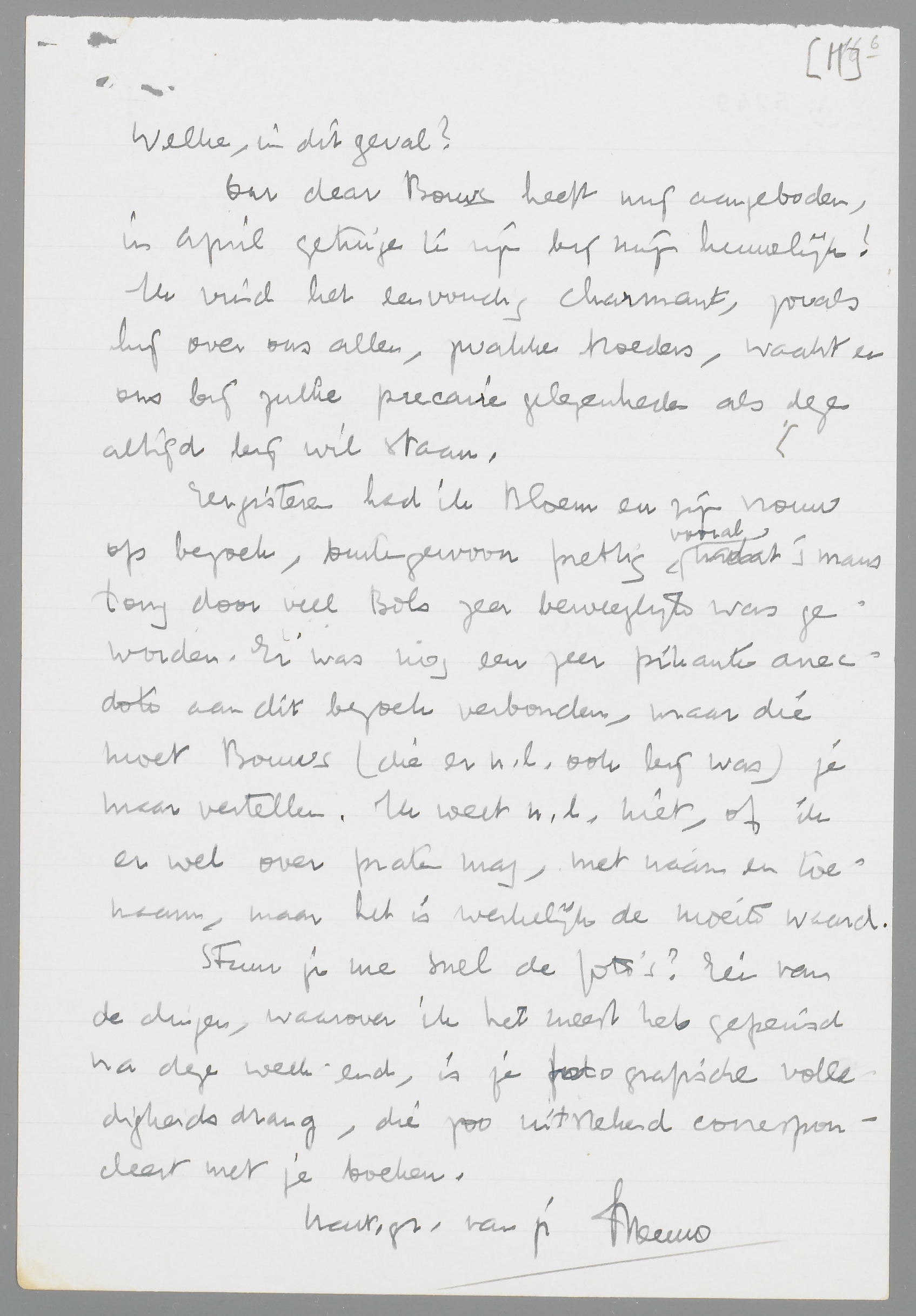 Eergisteren had ik Bloem en zijn vrouw op bezoek, buitengewoon prettig vooral omdat ’s mans tong door veel Bols zeer beweeglijk was geworden. Er was nog een zeer pikante anecdote aan dit bezoek verbonden, maar die moet Bouws (die er n.l. ook bij was) je maar vertellen. Ik weet n.l. niet, of ik er wel over praten mag, met naam en toenaam, maar het is werkelijk de moeite waard.
