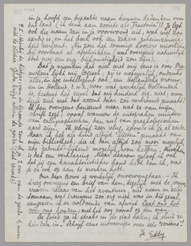 Ik ben uiterst benieuwd naar je 2 deelen. Heb je de proeven nu gesplitst? Zend mij alles, ook de nog ontbrekende copy. - Afscheid van Domineesland vind ik eig. niet zoo erg goed, vnl. misschien omdat het laatste woord te veel lettergrepen heeft: Domi-nees-land*). Zou je niet, met het dominées-idee achter in je hoofd een bepaalde naam kunnen bedenken voor dat land (ik denk aan zooiets als ‘Tractoria’)? Je legt ook die naam dan in je voorwoord uit, wat wèl zoo aardig is, en het boek ook een zekere geheimzinnigheid verleent. Nu zou het sommige koopers misschien bij voorbaat al afschrikken (wat overigens natuurlijk toch nog een erge bijkomstigheid zou zijn).