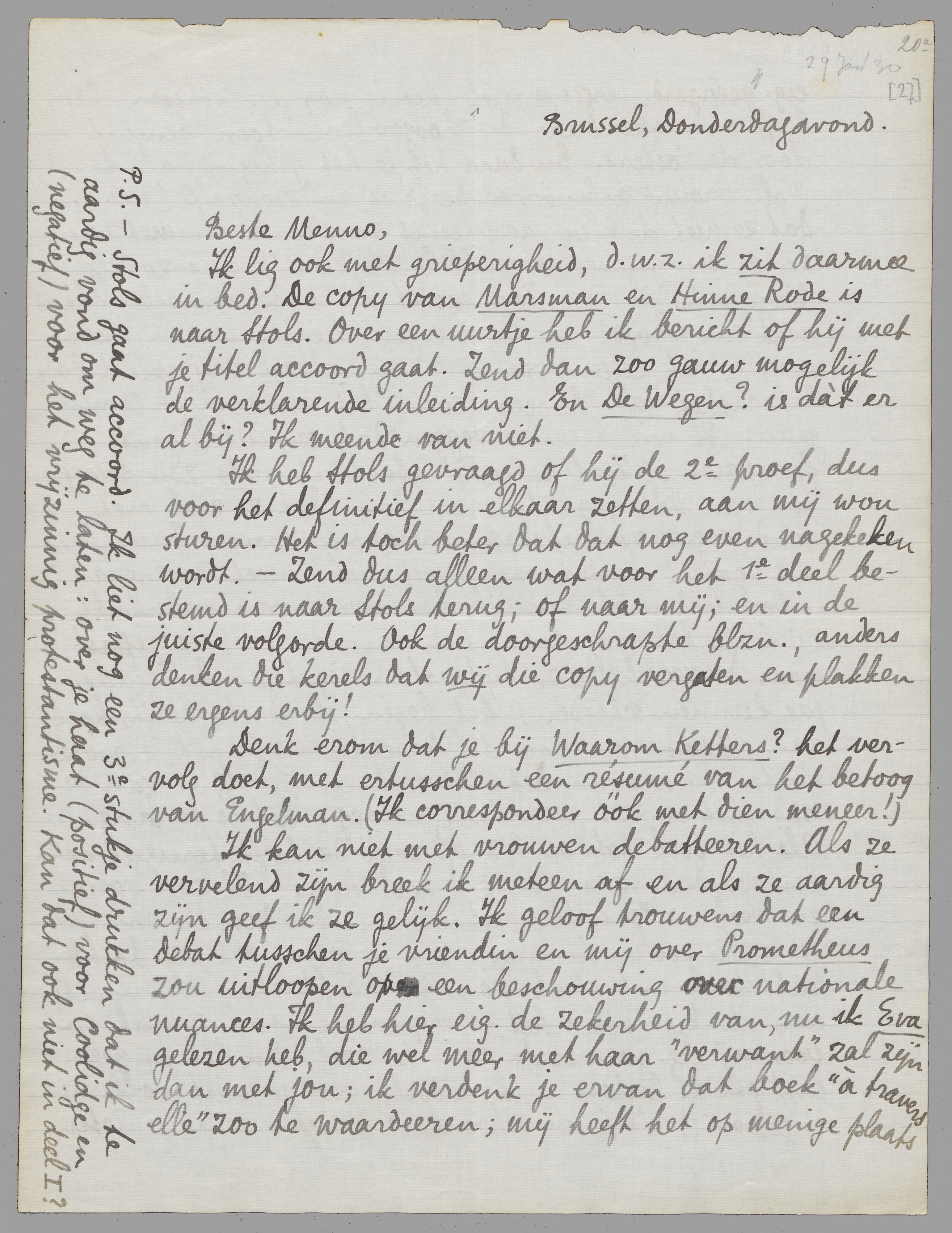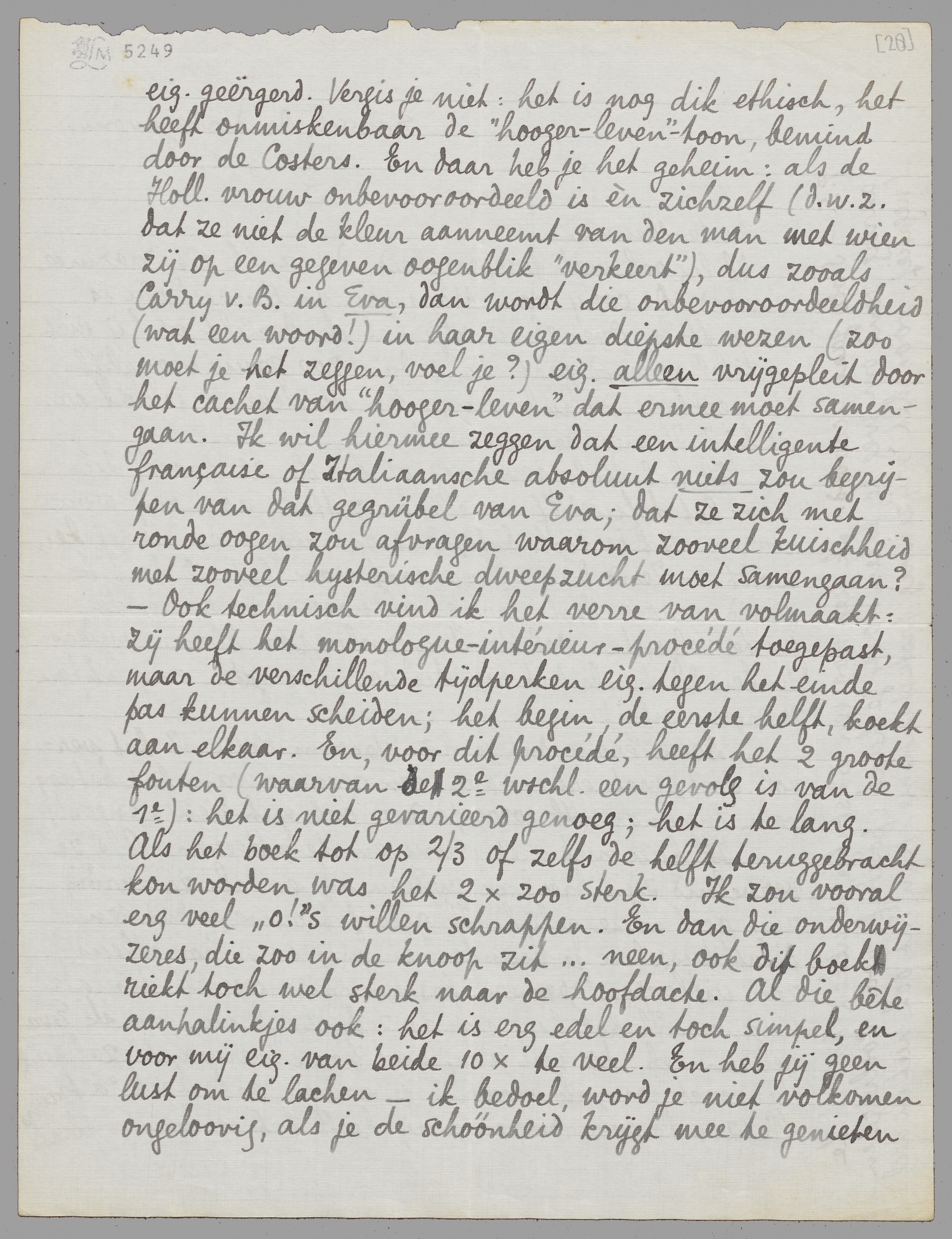 Ik kan niet met vrouwen debatteeren. Als ze vervelend zijn breek ik meteen af en als ze aardig zijn geef ik ze gelijk. Ik geloof trouwens dat een debat tusschen je vriendin en mij over Prometheus zou uitloopen op een beschouwing over nationale nuances. Ik heb hier eig. de zekerheid van, nu ik Eva gelezen heb, die wel meer met haar verwant zal zijn dan met jou; ik verdenk je ervan dat boek ‘à travers elle’ zoo te waardeeren; mij heeft het op menige plaats eig. geërgerd. Vergis je niet: het is nog dik ethisch, het heeft onmiskenbaar de ‘hooger-leven’-toon, bemind door de Costers. En daar heb je het geheim: als de Holl. vrouw onbevooroordeeld is èn zichzelf (d.w.z. dat ze niet de kleur aanneemt van den man met wien zij op een gegeven oogenblik ‘verkeert’), dus zooals Carry v.B. in Eva, dan wordt die onbevooroordeeldheid (wat een woord!) in haar eigen diepste wezen (zoo moet je het zeggen, voel je?) eig. alleen vrijgepleit door het cachet van ‘hooger-leven’ dat ermee moet samengaan. Ik wil hiermee zeggen dat een intelligente française of Italiaansche absoluut niets zou begrijpen van dat gegrübel van Eva; dat ze zich met ronde oogen zou afvragen waarom zooveel kuischheid met zooveel hysterische dweepzucht moet samengaan? - Ook technisch vind ik het verre van volmaakt: zij heeft het monologue-intérieur-procédé toegepast, maar de verschillende tijdperken eig. tegen het einde pas kunnen scheiden; het begin, de eerste helft, koekt aan elkaar. En, voor dit procédé, heeft het 2 groote fouten (waarvan de 2e wschl. een gevolg is van de 1e): het is niet gevarieerd genoeg; het is te lang. Als het boek tot op 2/3 of zelfs de helft teruggebracht kon worden was het 2 × zoo sterk. Ik zou vooral erg veel ‘o's!’ willen schrappen. En dan die onderwijzeres, die zoo in de knoop zit... neen, ook dit boek riekt toch wel sterk naar de hoofdacte. Al die bête aanhalinkjes ook: het is erg edel en toch simpel, en voor mij eig. van beide 10 × te veel. En heb jij geen lust om te lachen - ik bedoel, word je niet volkomen ongeloovig, als je de schóónheid krijgt mee te genieten van die verzen (die heusch wel samengaan met de rest):