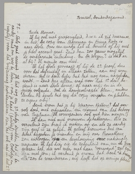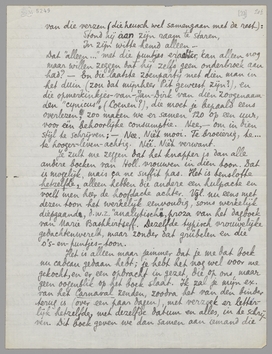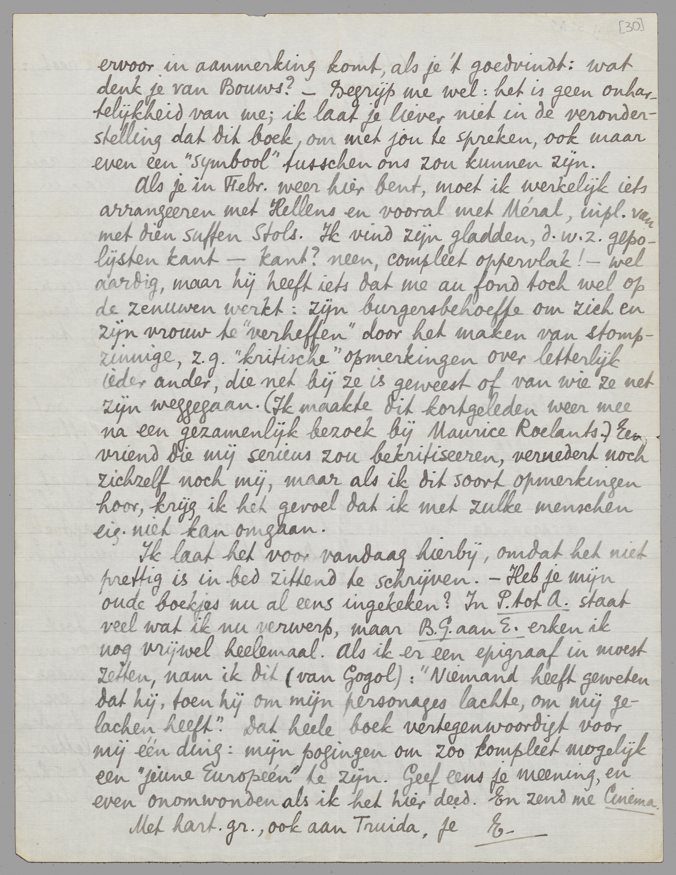 Ik laat het voor vandaag hierbij, omdat het niet prettig is in bed zittend te schrijven. - Heb je mijn oude boekjes nu al eens ingekeken? In P. tot A. staat veel wat ik nu verwerp, maar B.G. aan E. erken ik nog vrijwel heelemaal. Als ik er een epigraaf in moest zetten, nam ik dit (van Gogol): ‘Niemand heeft geweten dat hij, toen hij om mijn personages lachte, om mij gelachen heeft’. Dat heele boek vertegenwoordigt voor mij één ding: mijn pogingen om zoo kompleet mogelijk een ‘jeune Européen’ te zijn. Geef eens je meening, en even onomwonden als ik het hier deed. En zend me Cinema.