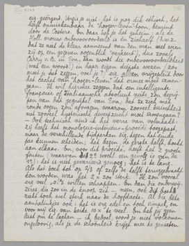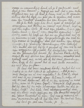 Het is alleen maar jammer dat je me dat boek nu cadeau gedaan hebt; je hebt het nog wel voor me gekocht, en er een opdracht in gezet, die op ons, maar geen oogenblik op het boek slaat. Ik zal je mijn ex. van het Carnaval zenden, zoodra het van den binder terug is (over een paar dagen), met verzoek er letterlijk hetzelfde, met dezelfde datum en alles, in te schrijven. Dit boek geven we dan samen aan iemand die ervoor in aanmerking komt, als je 't goedvindt; wat denk je van Bouws? - Begrijp me wel: het is geen onhartelijkheid van me; ik laat je liever niet in de veronderstelling dat dit boek, om met jou te spreken, ook maar even een ‘symbool’ tusschen ons zou kunnen zijn.