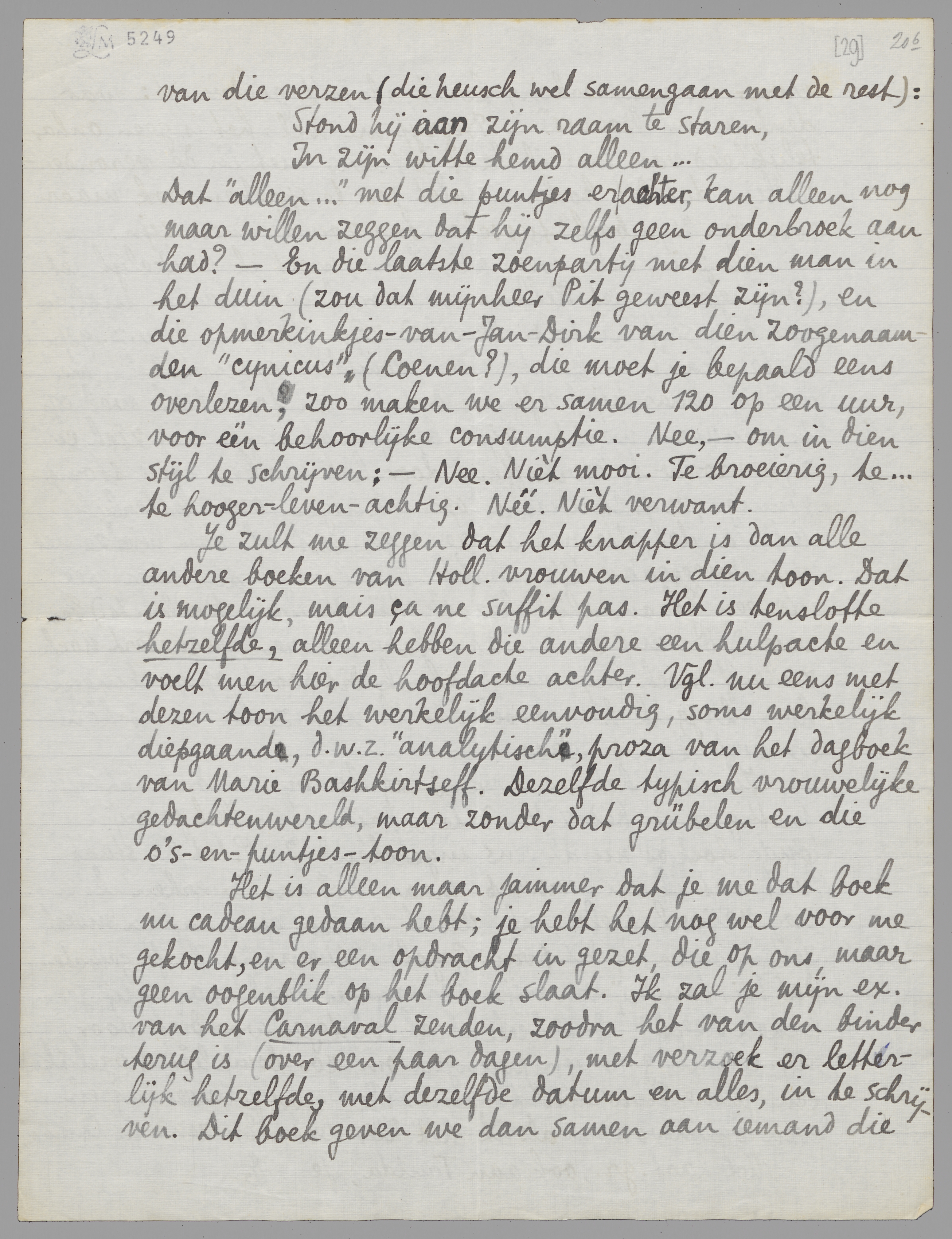 Je zult me zeggen dat het knapper is dan alle andere boeken van Holl. vrouwen in dien toon. Dat is mogelijk, mais ça ne suffit pas. Het is tenslotte hetzelfde, alleen hebben die andere een hulpacte en voelt men hier de hoofdacte achter. Vgl. nu eens met dezen toon het werkelijk eenvoudig, soms werkelijk diepgaand, d.w.z. ‘analytisch’, proza van het dagboek van Marie Bashkirtseff. Dezelfde typisch vrouwelijke gedachtenwereld, maar zonder dat grübelen en die o's-en-puntjes-toon.