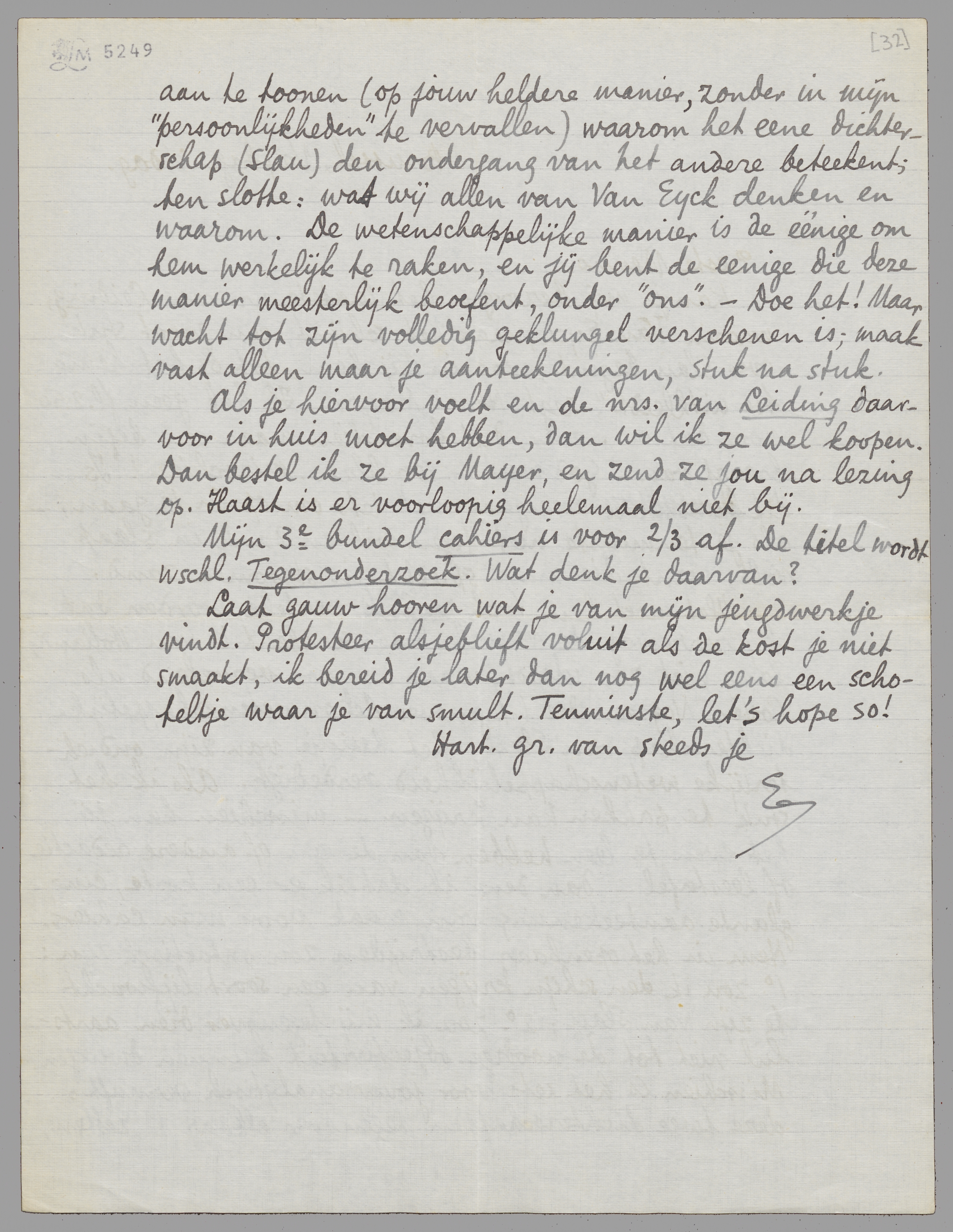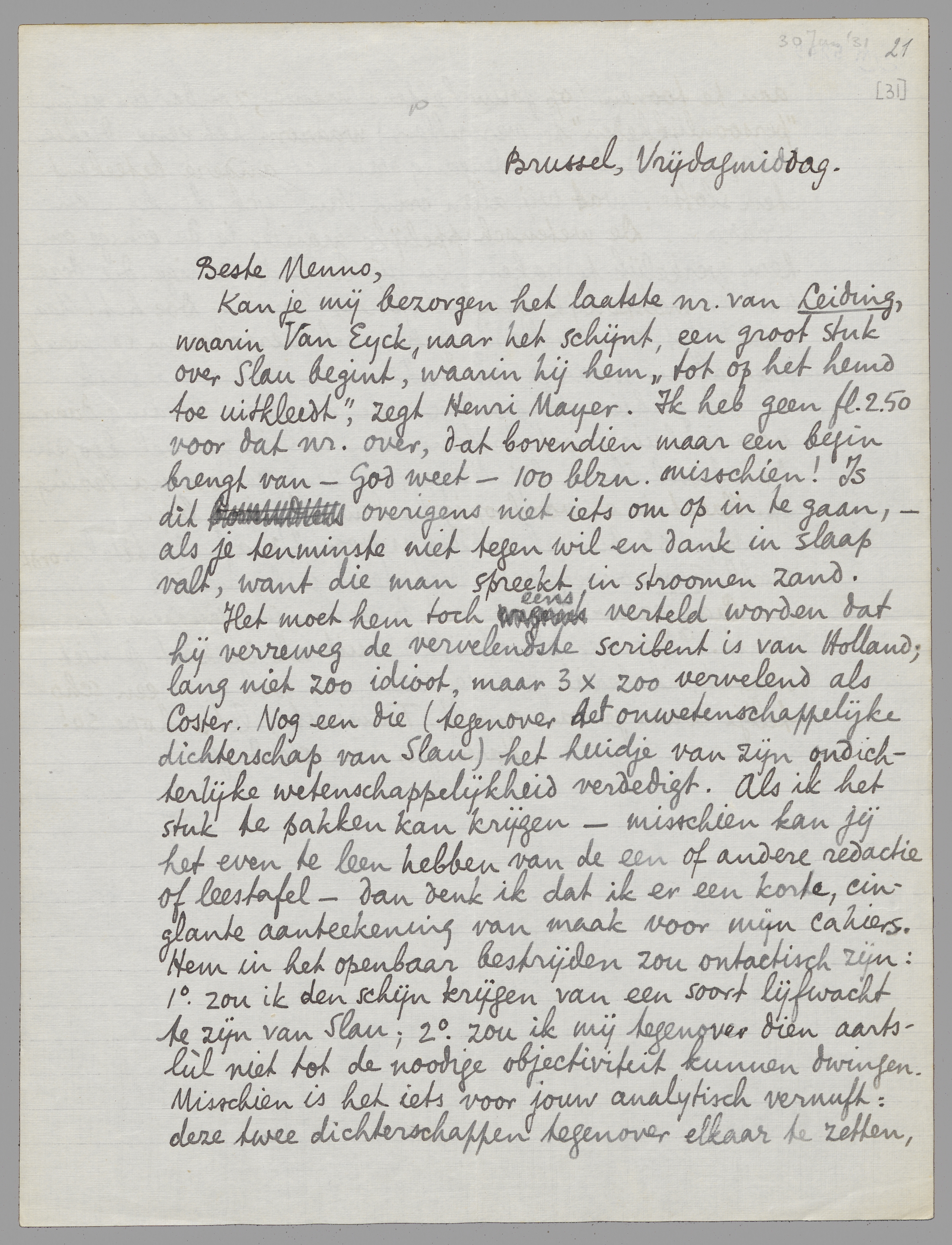 Kan je mij bezorgen het laatste nr. van Leiding, waarin Van Eyck, naar het schijnt, een groot stuk over Slau begint, waarin hij hem ‘tot op het hemd toe uitkleedt’, zegt Henri Mayer. Ik heb geen fl.2.50 voor dat nr. over, dat bovendien maar een begin brengt van - God weet - 100 blzn. misschien! Is dit overigens niet iets om op in te gaan, - als je tenminste niet tegen wil en dank in slaap valt, want die man spreekt in stroomen zand.