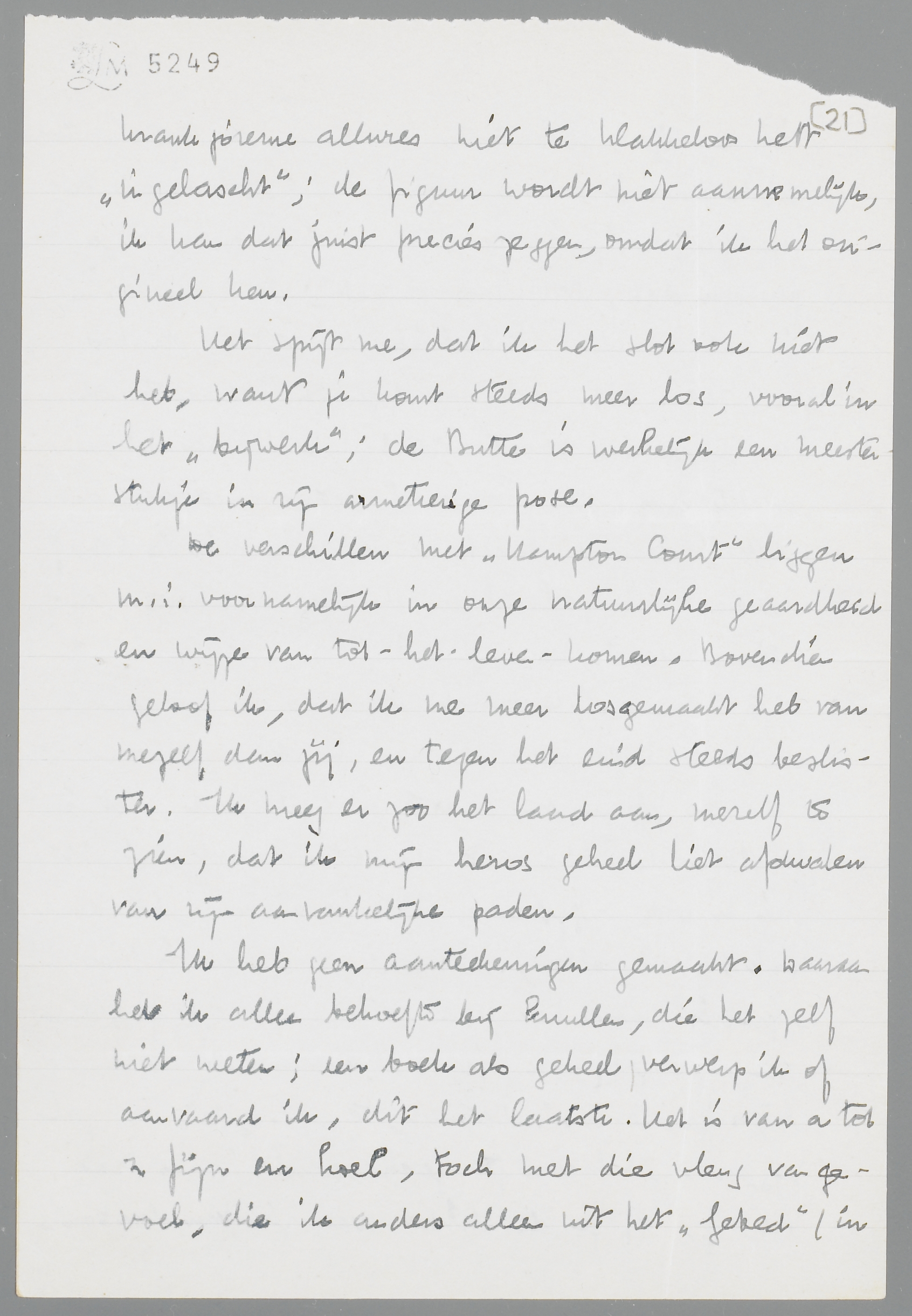 De verschillen met Hampton Court liggen m.i. voornamelijk in onze natuurlijke geaardheid en wijze van tot-het-leven-komen. Bovendien geloof ik, dat ik me meer losgemaakt heb van mezelf dan jij, en tegen het eind steeds beslister. Ik kreeg er zoo het land aan, mezelf te zien, dat ik mijn heros geheel liet afdwalen van zijn aanvankelijke paden.
