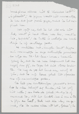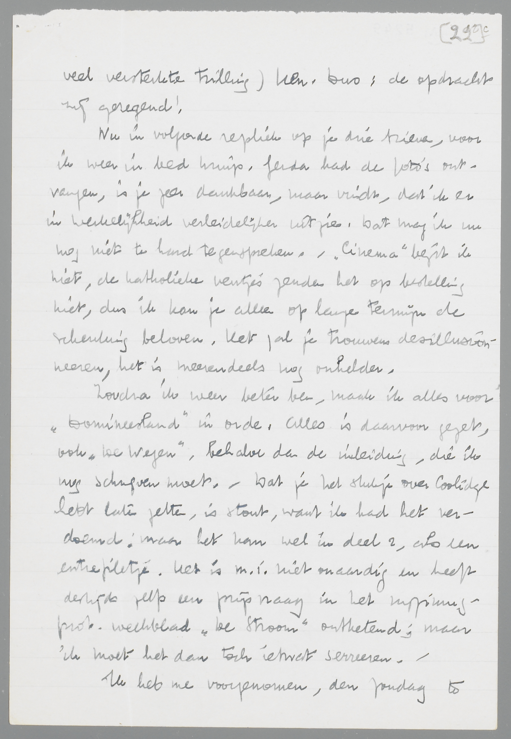 Zoodra ik weer beter ben, maak ik alles voor Domineesland in orde. Alles is daarvoor gezet, ook De Wegen, behalve dan de inleiding, die ik nog schrijven moet. - Dat je het stukje over Coolidge hebt laten zetten, is stout, want ik had het verdoemd, maar het kan wel in deel 2, als een entrefiletje. Het is m.i. niet onaardig en heeft destijds zelfs een prijsvraag in het vrijzinnig-protestantsch weekblad De Stroom ontketend; maar ik moet het dan toch ietwat serreeren. -