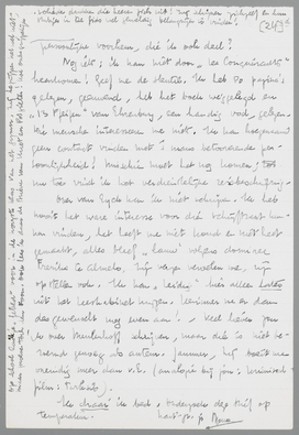 Nu Een Voorbereiding. Ik aanvaard de opdracht graag. Niet, omdat ik het een meesterwerk vind, maar omdat de sfeer mij eigenlijk nader staat, verwanter is dan die van Nutteloos Verzet b.v. (In de andere boeken lees ik juist, schrijf ik later over). Vooral, omdat het mutatis mutandis de algeheele parallel van Hampton Court is, dat ik graag aan je had opgedragen, maar dat al voor ik je kende, beloofd was aan het model voor den hoofdschurk van Haaften, zekere Jacques de Thouars. Doet er niet toe, de verwantschap is er toch, het verschil is er ook. - Een Voorbereiding is jeugdiger, maar ook spontaner, minder casuïstisch dan je andere werk. Ik kan het veel gemakkelijker in overeenstemming brengen met je persoon dan Nutteloos Verzet; de compositie is veel zwakker, hoewel ik de vertel-dialoog van Oscar c.s. toch ook eigenlijk heimelijk als een gesprek aan spontanïteit heb beschouwd, een zwakte dus, die voor jezelf het manco aan directe ‘weergave’ moet vervangen. Hier is het afwisselen van verhaal en dialoog natuurlijk eenzelfde zwakte, maar het hindert mij persoonlijk niet, trouwens ik spreek niet over den vorm, als de ‘gevormde inhoud’ mij boeit.