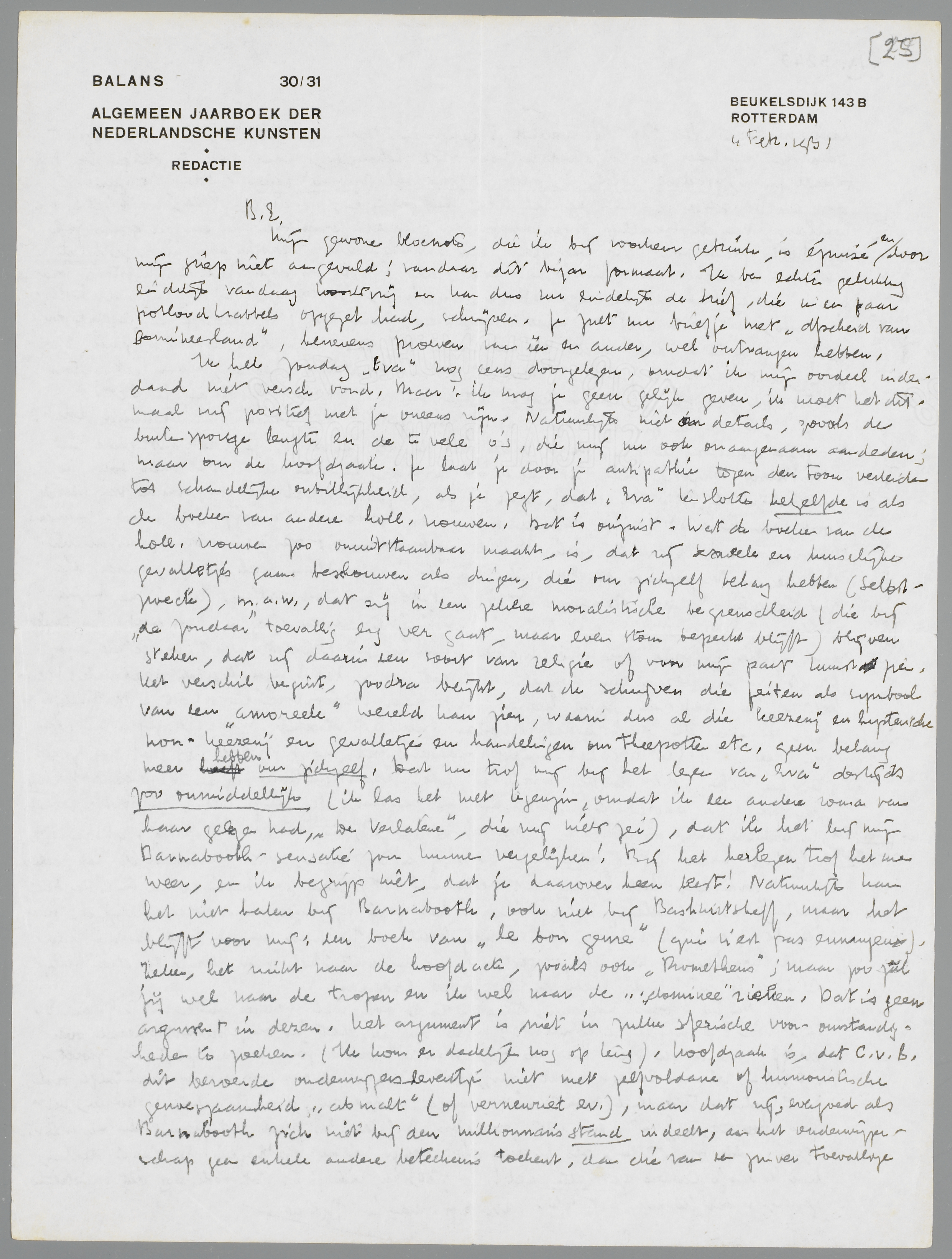 Nu ik erover nadenk, staan er toch ook wel betere dingen in B.G. aan E. Dit niet als hoffelijke concessie; maar ik zie, dat ik ongeproportioneerd overdrijf, omdat de sfeer me zoo tegenstaat. Zooals jou waarschijnlijk de zweet-S.D.A.P.-zilveren linten-lucht van Eva. Zouden we ons op dit waarschijnlijk toch niet geheel toevallige punt niet kunnen verzoenen, door er achter te komen, wat jou zoo tegen Eva, en mij zoo tegen B.G. aan E. deed uitvaren? Ik zou er b.v. geen prijs op stellen, als je me dit boekje wilde opdragen! En dan te denken, hoe ik van je Cahiers gevreten heb! Je ziet, ik wil je tot slot toch nog iets vriendelijks zeggen, maar ik meen het ook. Hart. gr. van je