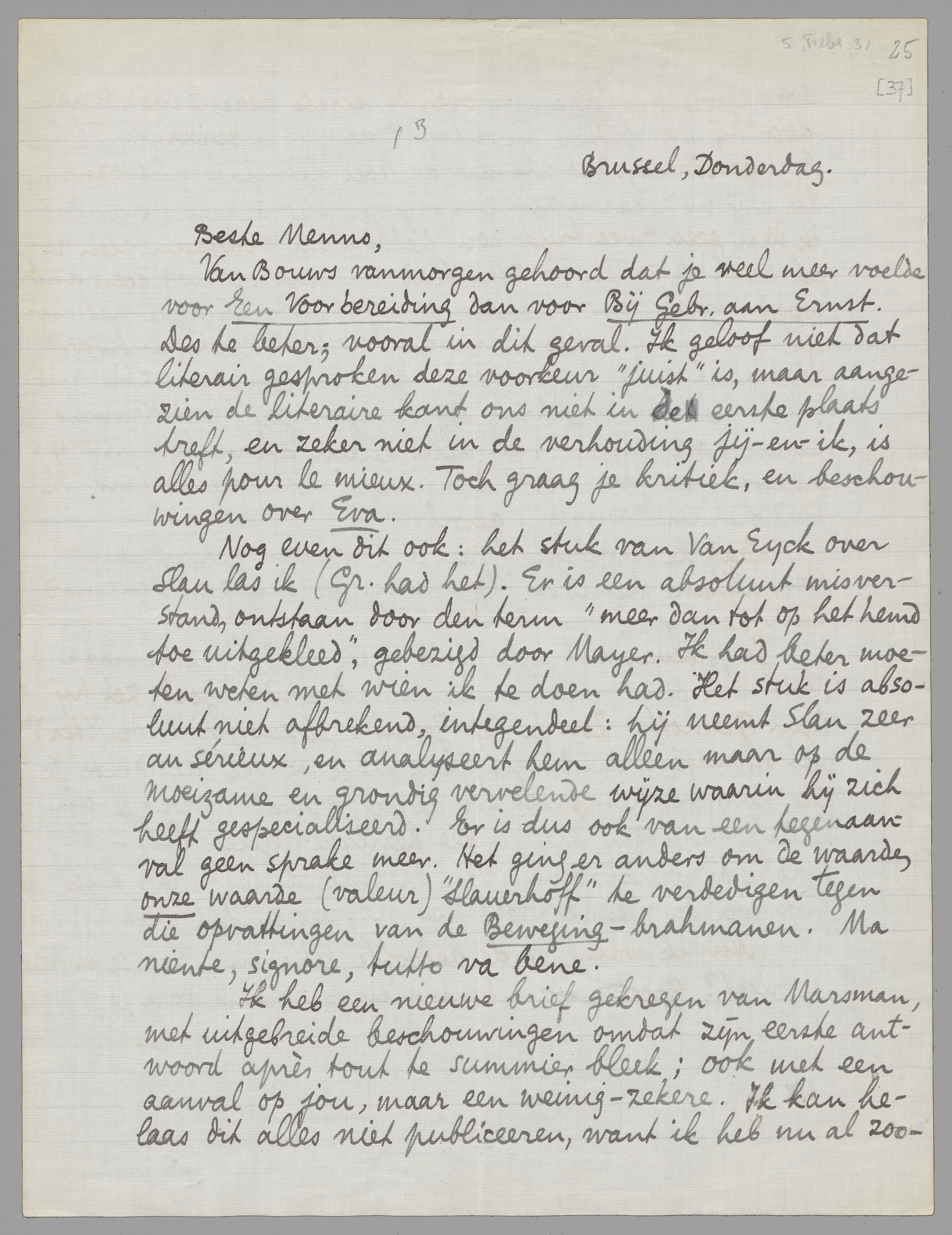 Nog even dit ook: het stuk van Van Eyck over Slau las ik (Gr. had het). Er is een absoluut misverstand, ontstaan door den term ‘meer dan tot op het hemd toe uitgekleed’, gebezigd door Mayer. Ik had beter moeten weten met wien ik te doen had. Het stuk is absoluut niet afbrekend, integendeel: hij neemt Slau zeer au sérieux, en analyseert hem alleen maar op de moeizame en grondig vervelende wijze waarin hij zich heeft gespecialiseerd. Er is dus ook van een tegenaanval geen sprake meer. Het ging er anders om de waarde, onze waarde (valeur) ‘Slauerhoff’ te verdedigen tegen die opvattingen van de Beweging-brahmanen. Ma niente, signore, tutto va bene.