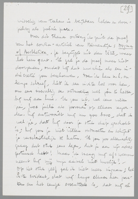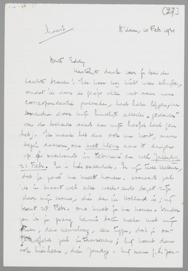 Hartelijk dank voor je beide laatste brieven! Ik kon nog niet weer schrijven, omdat ik door de griep alles wat maar naar correspondentie zweemde, had laten liggen, en bovendien door mijn huwelijk allerlei ‘gedonder’ van de bekende aard aan mijn hoofd had (en heb). Ik maak het dus ook nu kort, maar begin daarom, om met klem aan te dringen op je overkomst in Februari en wel Zaterdag 21 Febr. Er is hier onderdak. Er zijn twee redenen, dat je persé nu moet komen. Vooreerst zal ik in Maart wel alle week-ends bezet zijn door mijn vrouw, die dan in Holland is; zij komt 28 Febr. Dus moet je nu komen. Verder zou ik je graag kennis laten maken met mijn broer, den neuroloog, een type, dat je ongetwijfeld zal interesseeren; hij komt dan ook hierheen, dien Zondag. Hij nam j.l. Zondag één van je boekjes toevallig op, keek er in, en zei: ‘Goddorie, iemand van internationaal formaat’. Hij is voor mij het prototype van het genie, leest zelden iets, buiten zijn kattenhersens en neurosen, en ‘weet’ alles; mist alle eerzucht, zal daardoor nooit veel produceeren, maar is volkomen met afwering van alle andere levensinteressen! ingesteld op de cultuur. Ik ‘stel je hem niet voor’ als een genie; hoe zou ik mijn broer trouwens zoo kunnen en willen introduceeren? Maar als iemand, die mij altijd weer aan het geniale herinnert. Hij wilde graag met je kennis maken, heeft dien dag voorloopig vrijgehouden. Tracht dus de munten voor de reis vrij te maken; hier hoef je geen kosten te maken, het eten is er. Dus: je instemmend bericht binnenkort?