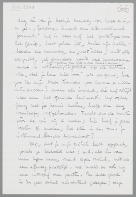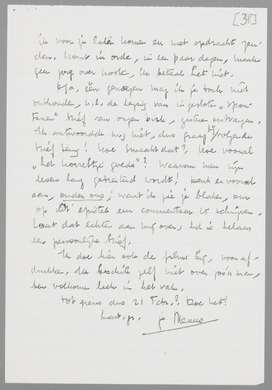 Oja, één genoegen mag ik je toch niet onthouden, n.l. de lezing van ingesloten ‘spontanen’ brief van onzen Dirk, gisteren ontvangen. Ik antwoordde nog niet, dus graag bij volgende brief terug! Hoe smaakt dat? Hoe vooral ‘het korreltje goeds’? Waarom men zijn leven lang getreiterd wordt! Denk er vooral aan, onder ons; want ik zie je blaken, om op dit epistel een commentaar te schrijven. Laat dat echter aan mij over, het is helaas een persoonlijke brief.