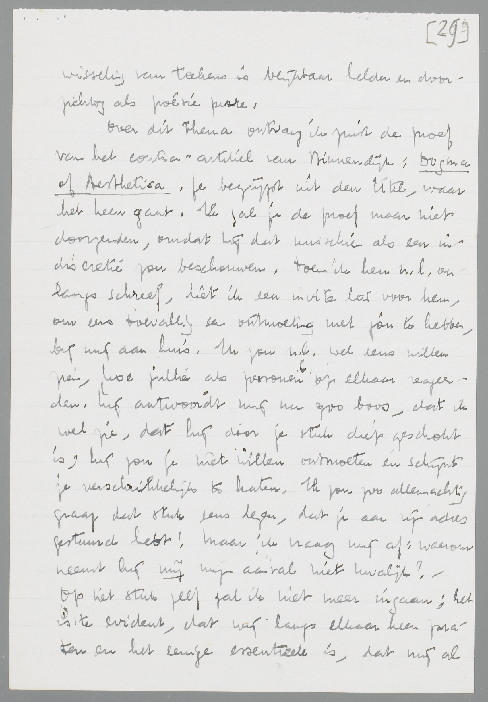 Blij, dat je mijn critiek hebt opgevat, zooals ze bedoeld was: n.l. als één van man tegen man, vriend tegen vriend, niet als een afweegpartijtje. We moeten er ook nog eens uitvoerig over praten. In ieder geval is er geen enkel misverstand gerezen; onze wisseling van teekens is blijkbaar helder en doorzichtig als poésie pure.