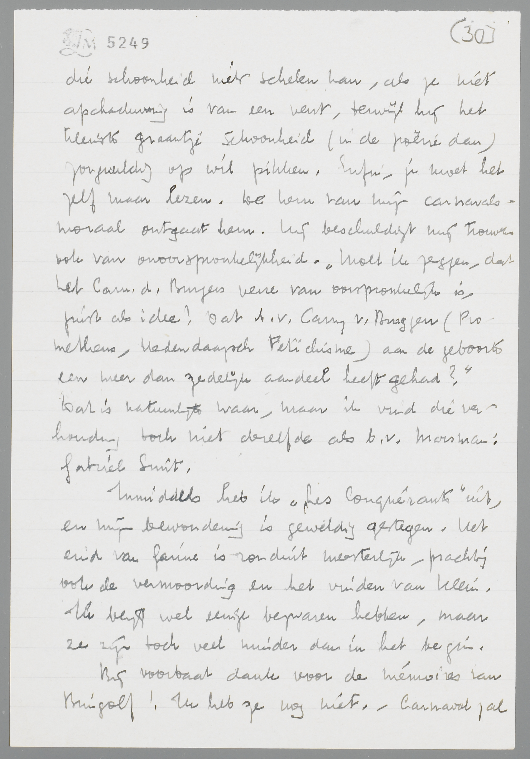 Over dit thema ontvang ik juist de proef van het contra-artikel van Binnendijk: Dogma of Aesthetica. Je begrijpt uit den titel, waar het heen gaat. Ik zal je de proef maar niet doorzenden, omdat hij dat misschien als een indiscretie zou beschouwen. Toen ik hem n.l. onlangs schreef, liet ik een invite los voor hem, om eens toevallig een ontmoeting met jou te hebben, bij mij aan huis. Ik zou n.l. wel eens willen zien, hoe jullie als personen op elkaar reageerden. Hij antwoordt mij nu zoo boos, dat ik wel zie, dat hij door je stuk diep geschokt is; hij zou je niet willen ontmoeten en schijnt je verschrikkelijk te haten. Ik zou zoo allemachtig graag dat stuk eens lezen, dat je aan zijn adres gestuurd hebt! Maar ik vraag mij af: waarom neemt hij mij mijn aanval niet kwalijk? - Op het stuk zelf zal ik niet meer ingaan; het is te evident, dat wij langs elkaar heen praten en het eenige essentieele is, dat mij al die schoonheid niets schelen kan, als ze niet afschaduwing is van een vent, terwijl hij het kleinste graantje schoonheid (in de poëzie dan) zorgvuldig op wil pikken. Enfin, je moet het zelf maar lezen. De kern van mijn carnavalsmoraal ontgaat hem. Hij beschuldigt mij trouwens ook van onoorspronkelijkheid. ‘Moet ik zeggen, dat het Carn. d. Burgers verre van oorspronkelijk is, juist als idee? Dat b.v. Carry v. Bruggen (Prometheus, Hedendaagsch Fetichisme) aan de geboorte een meer dan zedelijk aandeel heeft gehad?’ Dat is natuurlijk waar, maar ik vind die verhouding toch niet dezelfde als b.v. Marsman: Gabriel Smit.