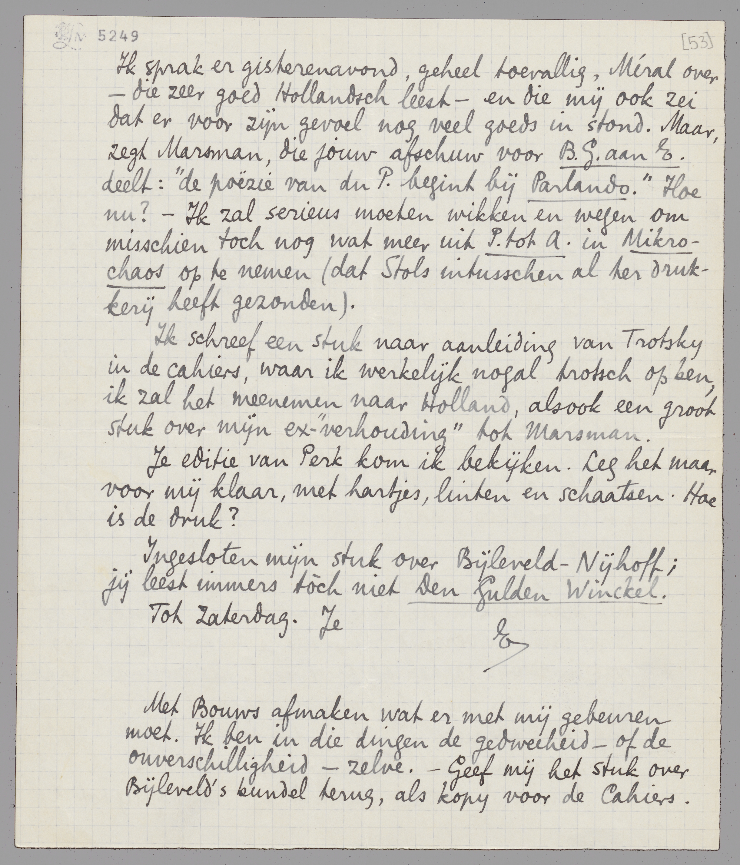 Benieuwd naar je aanwijzingen in Poging tot A. Ik sprak er gisterenavond, geheel toevallig, Méral over - die zeer goed Hollandsch leest - en die mij ook zei dat er voor zijn gevoel nog veel goeds in stond. Maar, zegt Marsman, die jouw afschuw voor B.G. aan E. deelt: ‘de poëzie van du P. begint bij Parlando’. Hoe nu? - Ik zal serieus moeten wikken en wegen om misschien toch nog wat meer uit P. tot A. in Mikrochaos op te nemen (dat Stols intusschen al ter drukkerij heeft gezonden).