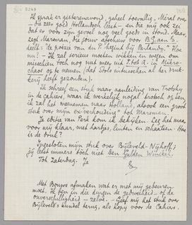 Met Bouws afmaken wat er met mij gebeuren moet. Ik ben in die dingen de gedweeheid - of de onverschilligheid - zelve. - Geef mij het stuk over Bijleveld's bundel terug, als kopy voor de Cahiers.