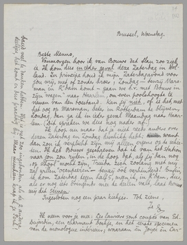 Vanmorgen hoor ik van Bouws dat Slau zoo ziek is. Ik kom dus in ieder geval deze Zaterdag in Holland. In principe houd ik mijn Zaterdagavond voor jou vrij, met of zonder broer; Zondag - tenzij Marsman in R'dam komt - gaan we b.v. met Bouws in zijn ‘wagen’ naar Haarlem, om even poolshoogte te nemen van den toestand. Kan jij niet, of is het, met het oog op Marsman, beter in Rotterdam te blijven, Zondag, dan ga ik in ieder geval Maandag naar Haarlem. (Dit spreken we dus nog nader af.)