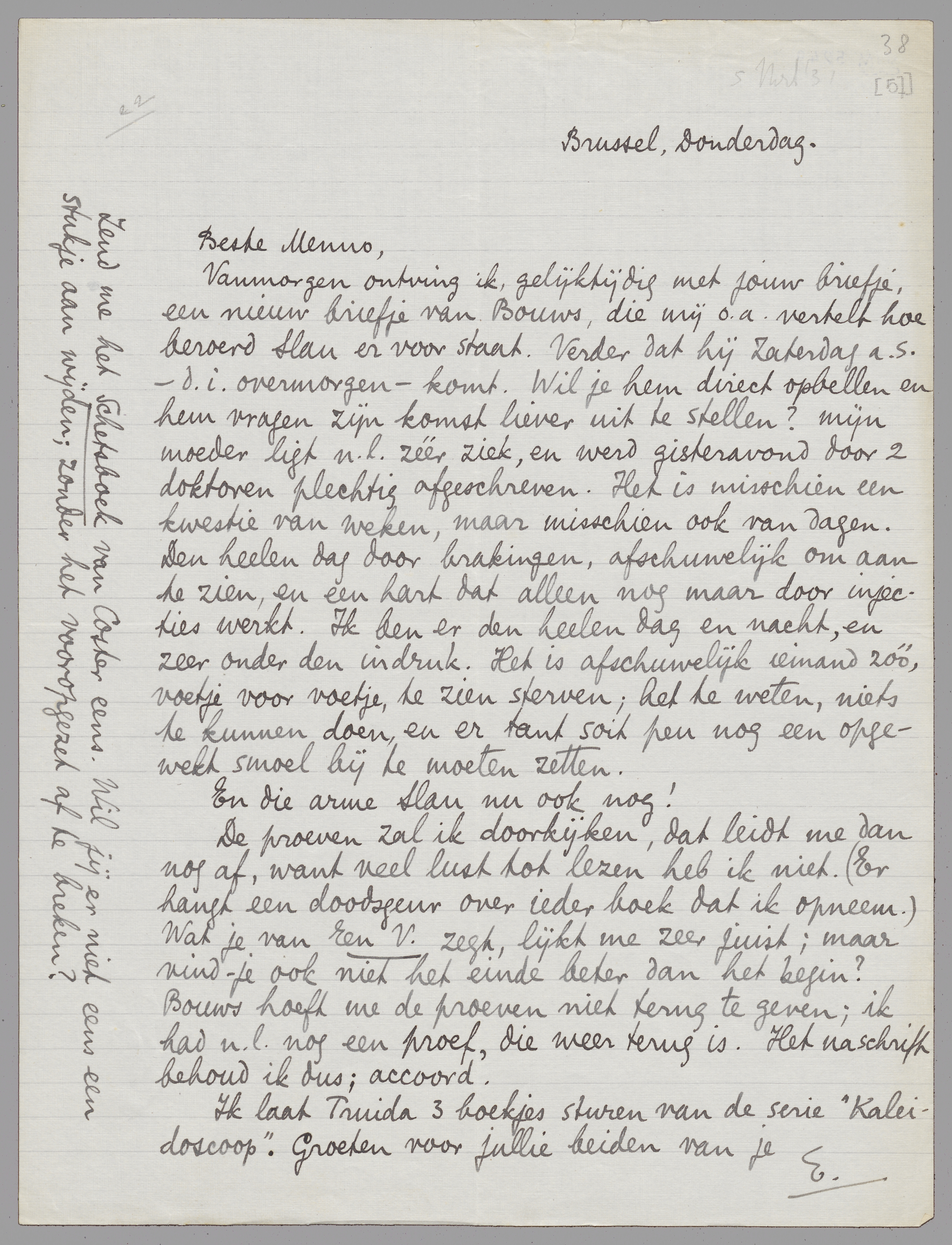 Vanmorgen ontving ik, gelijktijdig met jouw briefje, een nieuw briefje van Bouws, die mij o.a. vertelt hoe beroerd Slau er voor staat. Verder dat hij Zaterdag a.s. - d.i. overmorgen - komt. Wil je hem direct opbellen en hem vragen zijn komst liever uit te stellen? mijn moeder ligt n.l. zéér ziek, en werd gisteravond door 2 doktoren plechtig afgeschreven. Het is misschien een kwestie van weken, maar misschien ook van dagen. Den heelen dag door brakingen, afschuwelijk om aan te zien, en een hart dat alleen nog maar door injecties werkt. Ik ben er den heelen dag en nacht, en zeer onder den indruk. Het is afschuwelijk iemand zóó, voetje voor voetje, te zien sterven; het te weten, niets te kunnen doen, en er tant soit peu nog een opgewekt smoel bij te moeten zetten.