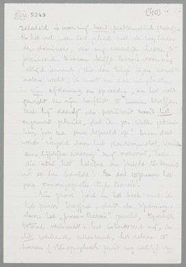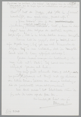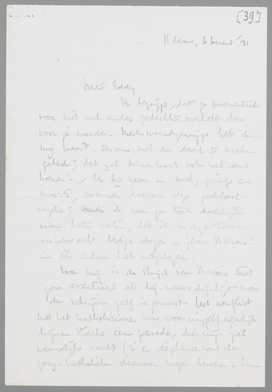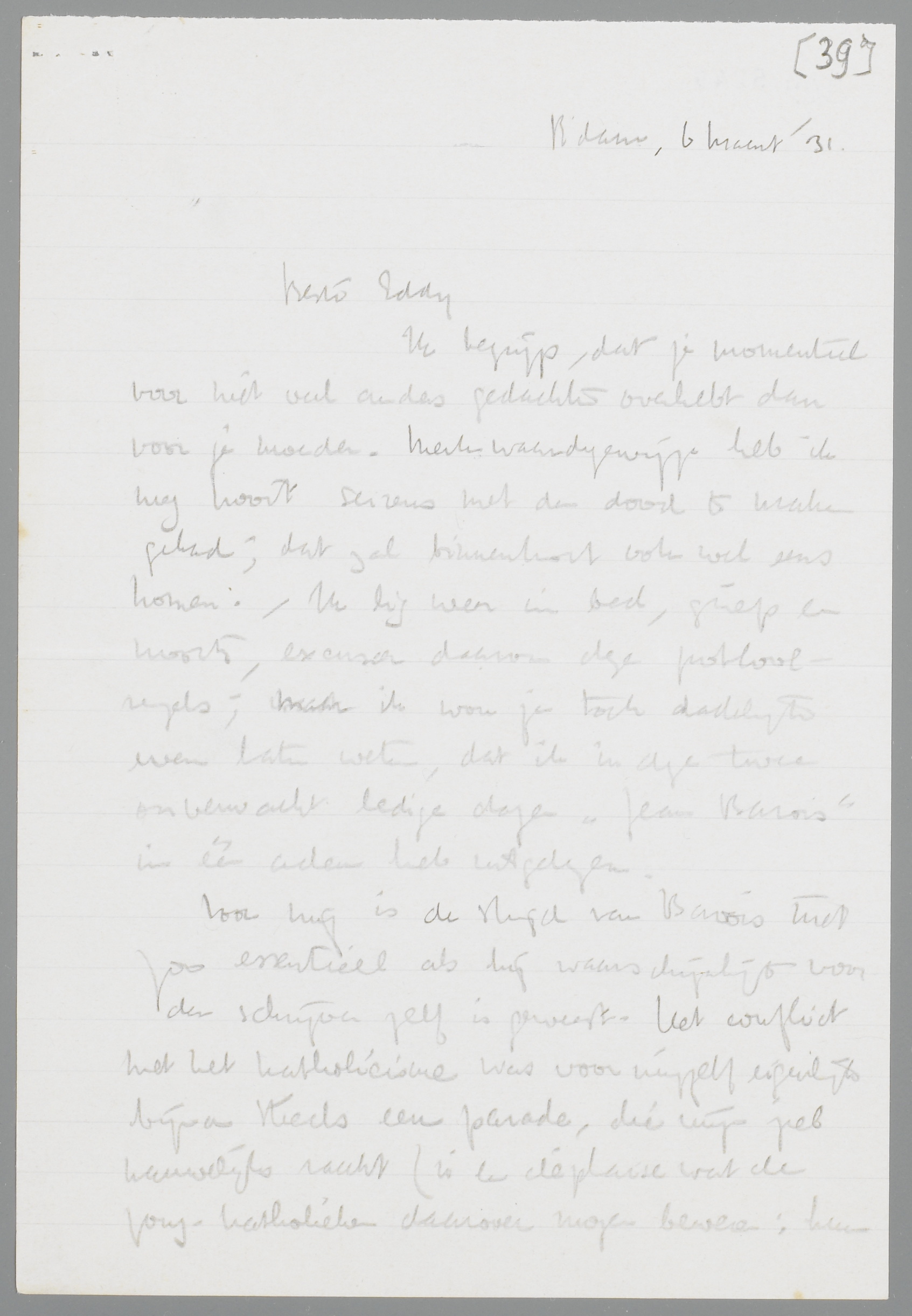 Ik begrijp, dat je momenteel voor niet veel anders gedachten overhebt dan voor je moeder. Merkwaardigerwijze heb ik nog nooit serieus met den dood te maken gehad; dat zal binnenkort ook wel eens komen. - Ik lig weer in bed, griep en koorts, excuseer daarom deze potloodregels; maar ik wou je toch dadelijk even laten weten, dat ik in deze twee onverwacht ledige dagen Jean Barois in één adem heb uitgelezen.