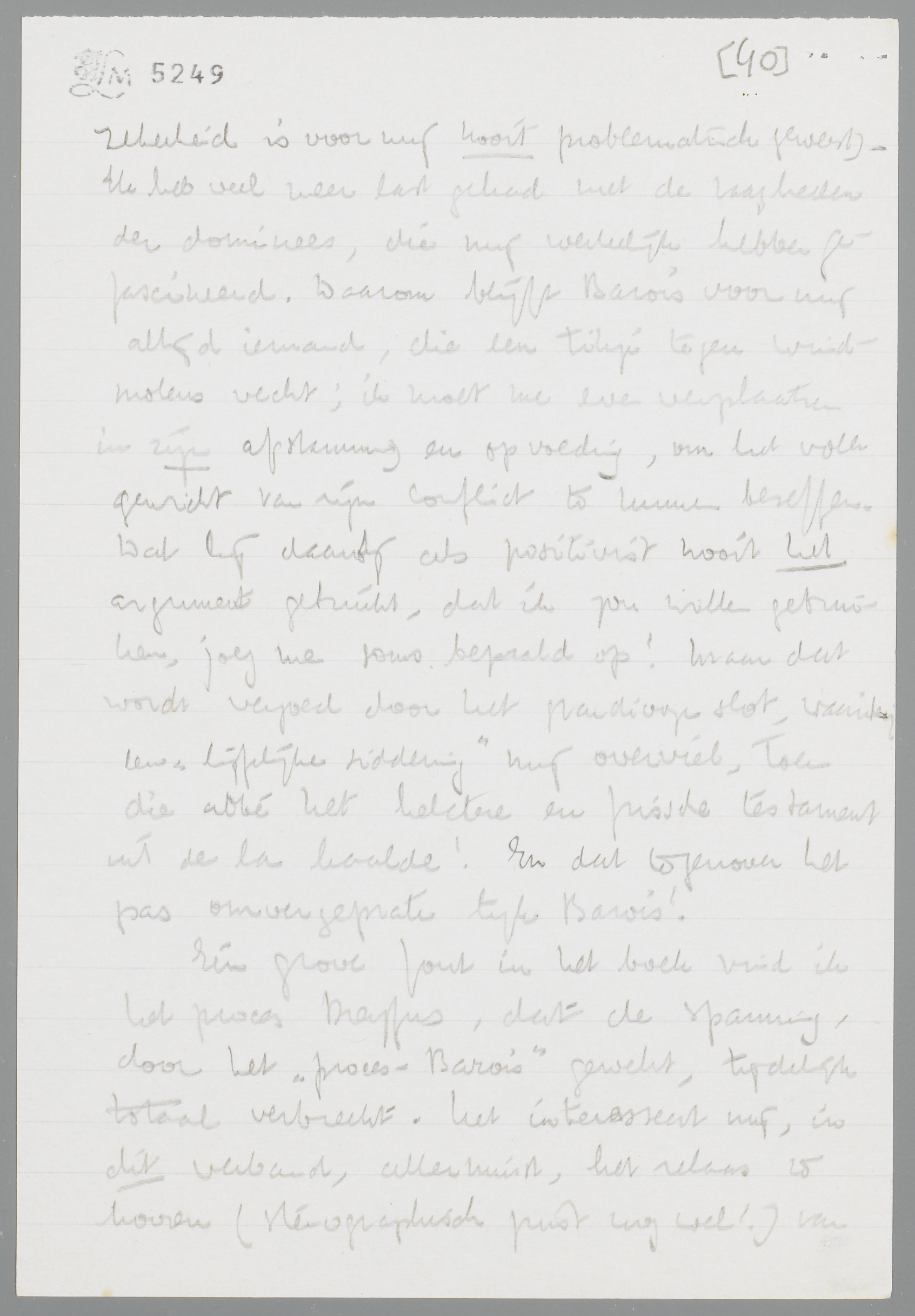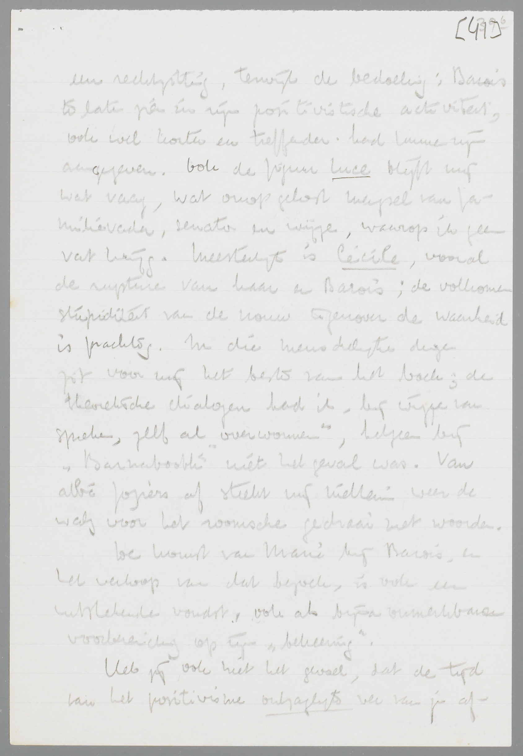 Eén grove fout in het boek vind ik het proces Dreyfus, dat de spanning, door het ‘proces-Barois’ gewekt, tijdelijk totaal verbreekt. Het interesseert mij, in dit verband, allerminst, het relaas te hooren (stenografisch juist nog wel!) van een rechtzitting, terwijl de bedoeling: Barois te laten zien in zijn positivistische activiteit, ook wel korter en treffender had kunnen zijn aangegeven. Ook de figuur Luce blijft mij wat vaag, wat onopgelost mengsel van familievader, senator en wijze, waarop ik geen vat krijg. Meesterlijk is Cecile, vooral de rupture van haar en Barois; de volkomen stupiditeit van de vrouw tegenover de waarheid is prachtig. In die menschelijke dingen zit voor mij het beste van het boek; de theoretische dialogen had ik, bij wijze van spreken, zelf al ‘overwonnen’, hetgeen bij Barnabooth niet het geval was. Van abbé Joziers af steekt mij niettemin weer de walg voor het roomsche gedraai met woorden.